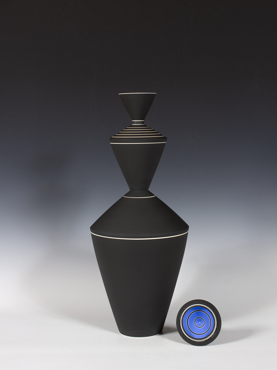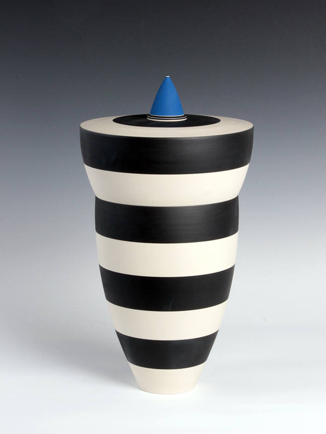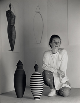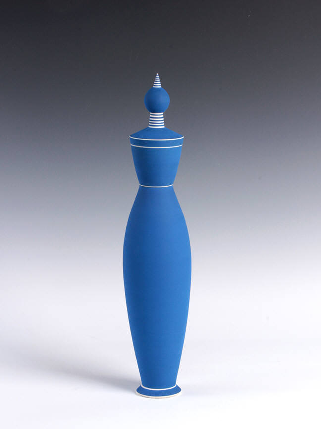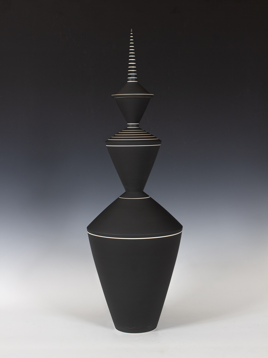 For over a decade, Roseline Delisle (1952-2003) dreamed of making large-scale ceramic sculpture. She first realized her goal in an exhibition of six figurative sculptures in the fall of 1996. Her recent work presents a vision of purity and perfection, a world of balance and symmetry. Their stability and strength complement the precision of the slender, seemingly fragile figures. Bold and graphic, the tall and totemic sculptures are deeply rooted in early twentieth century abstraction. Delisle’s ability to marry these polarities is her triumph.Although most of her early work was made in the demanding medium of fired porcelain, Delisle turned to an earthenware clay body to realize her ambitious figurative pieces. The years of experience with porcelain proved valuable, as she developed a means of stacking sections of interlocking cylinders to create larger forms. The first six sculptures were made of eight, ten or eleven different elements, fused together in a nearly seamless line. With foot, body, waist and head, these hollow vessels have a human presence. The artist is in control of her elements—line, form, volume and color—yet is able to find a fertile ground for exploration.