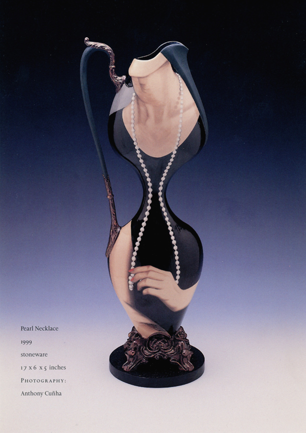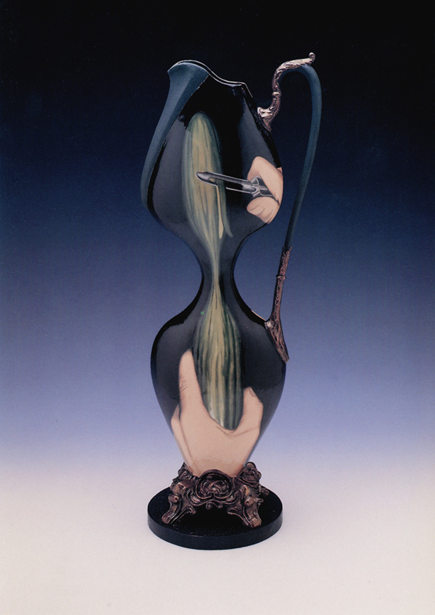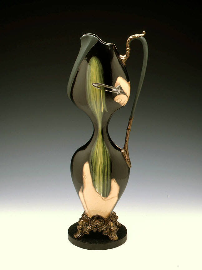 Kolodziejski pursues the exaggerated formal and thematic flourishes of her Victoriana with a vengeance, tapping into its psychosexual core. Pearl Necklace (1999), a slender pitcher with an extremely pinched waist, features on one side the depiction of a buxom woman’s torso draped with a long set of pearls; on the other side is the image of a long cucumber being peeled to conform to a narrow hourglass shape. With its showgirl proportions, the seemingly corseted, hyper-female shape of the vessel complements in a perversely satisfying way the suggestively phallic scene of cucumber-peeling. The pearl clutching woman seems to have found an outlet for her frustrations.