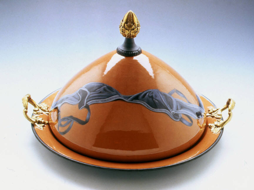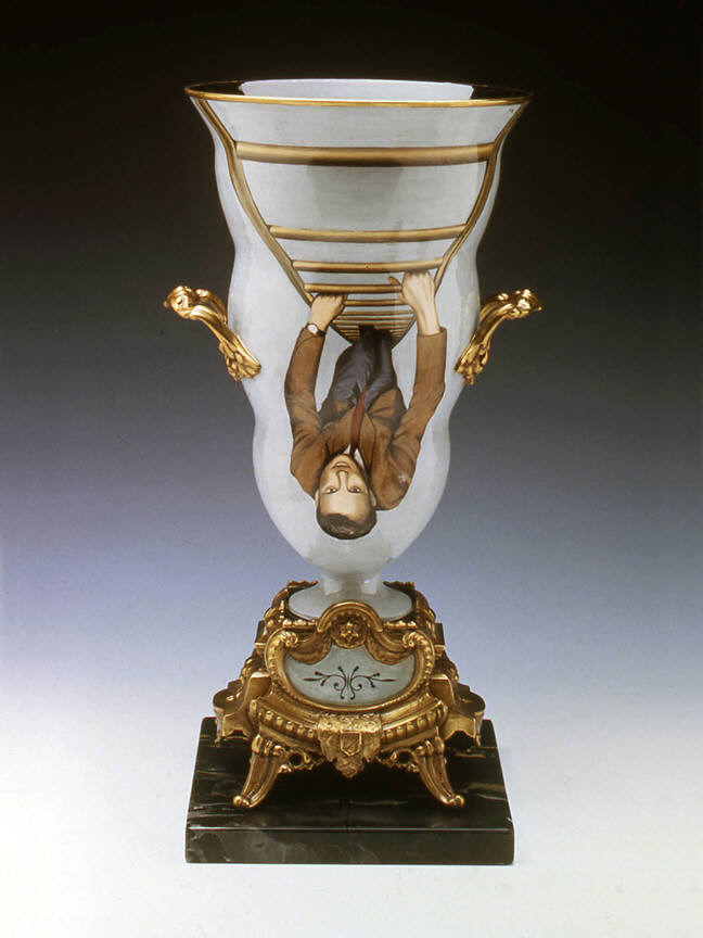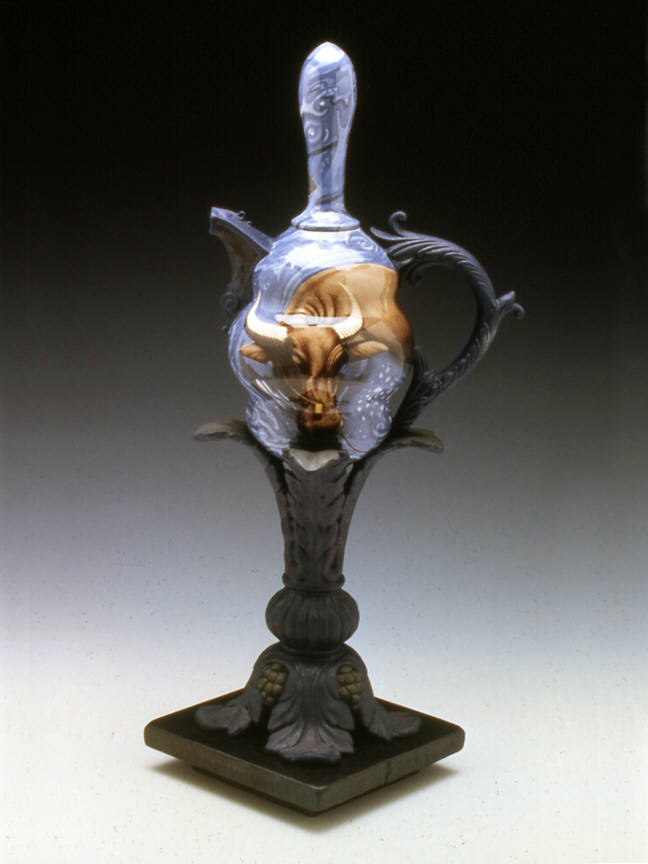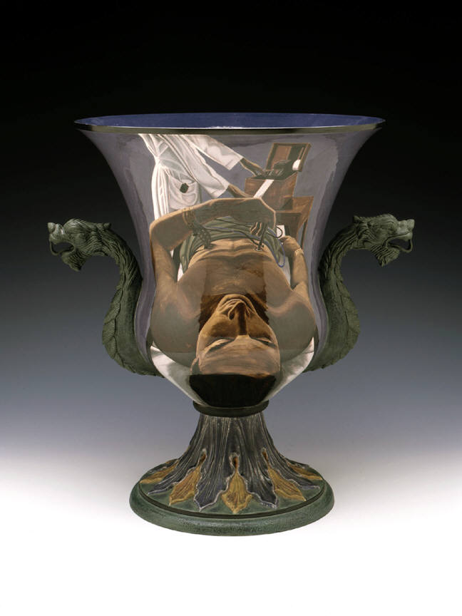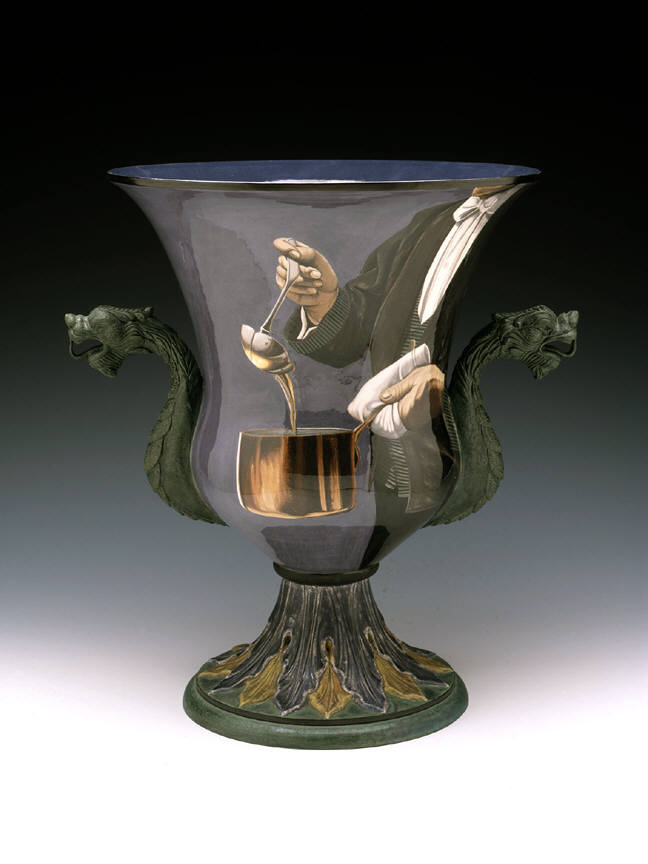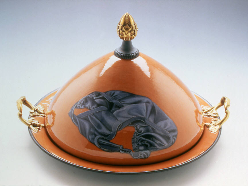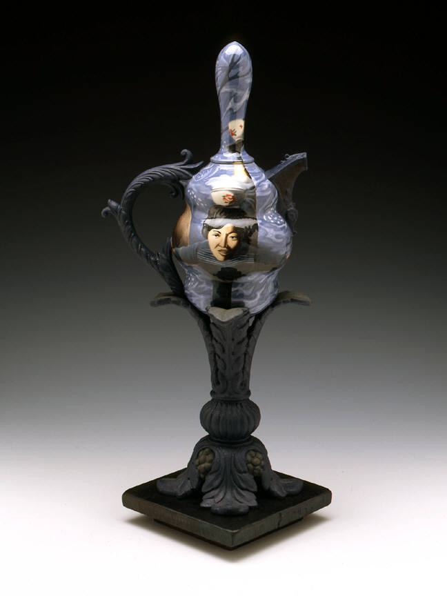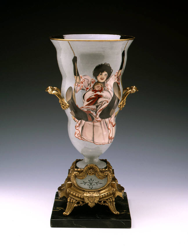 Ceramic artist Cindy Kolodziejski paints meticulous scenes on her glazed earthenware vases, teapots and tureens. Often using the handles of these old-fashioned domestic vessels as dividers, she presents paired images with surprising narrative contrasts. On one side of Champagne Bucket (1999), for example, Kolodziejski depicts from above a man climbing a ladder, as if scaling the fluted vessel. On the other side, a blowsy woman in peasant garb leans back on a swing, revealing a full view of her petticoats. On a kind of “champagne high,” these two figures suggest a comic sexual roundelay.