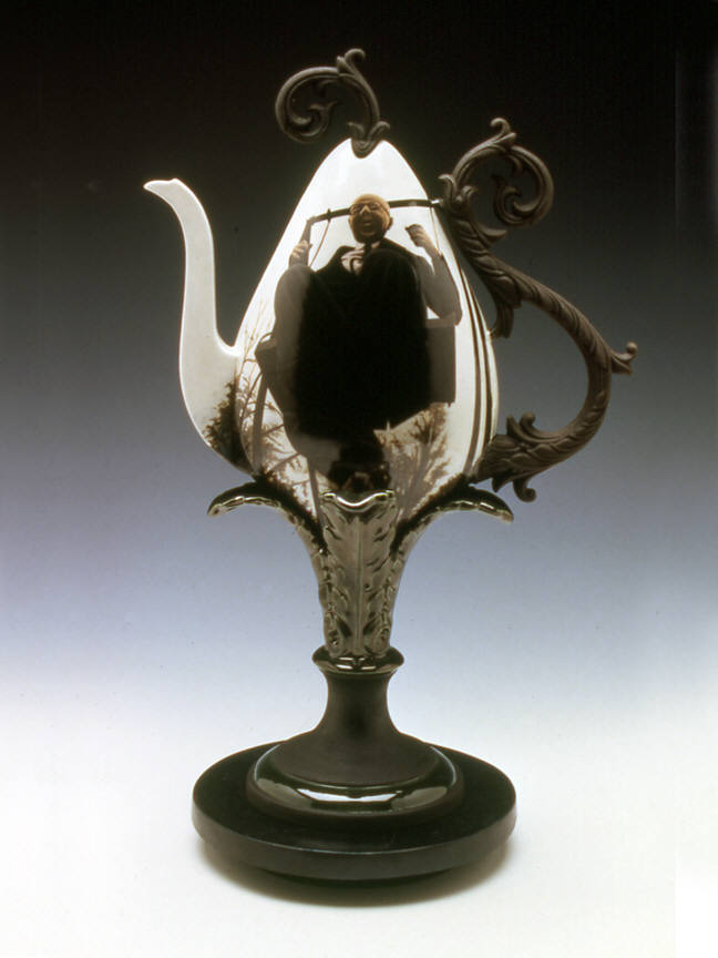 To and Fro (1998) presents a gentler but similarly pointed vignette. On one side of a pear-shaped teapot with a high pedestal base is painted the image of a similarly pear-shaped older man in a swing who peers down from the apex of his trajectory. On the other side is the same suited figure, seemingly at the opposite end of his arc. The low-angle point of view perches the teapot man high above us, like a kind of happy CEO swinging along obliviously.