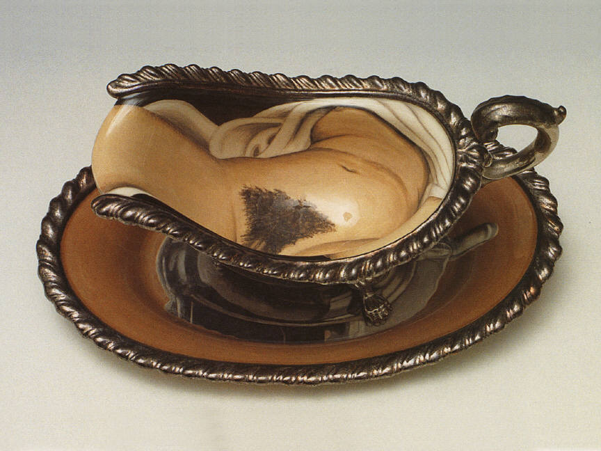 Kolodziejski’s vessels toy with the exaggerated details of Belle Époque decoration. Garish handles, knobs and bases cast from Victorian lamps and furniture decorate her works, parodying the stultifying ornateness that marked the era. In the cavity of a fancy gravy boat, Kolodziejski paints perhaps the naughtiest image in 19th-century painting, Courbet’s Origin of the World. Aptly enough, this crotch-shot depiction of a female nude is meant to be drowned in butter-enriched fatty sauce.