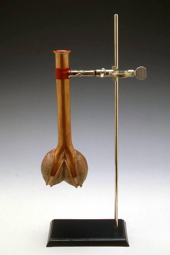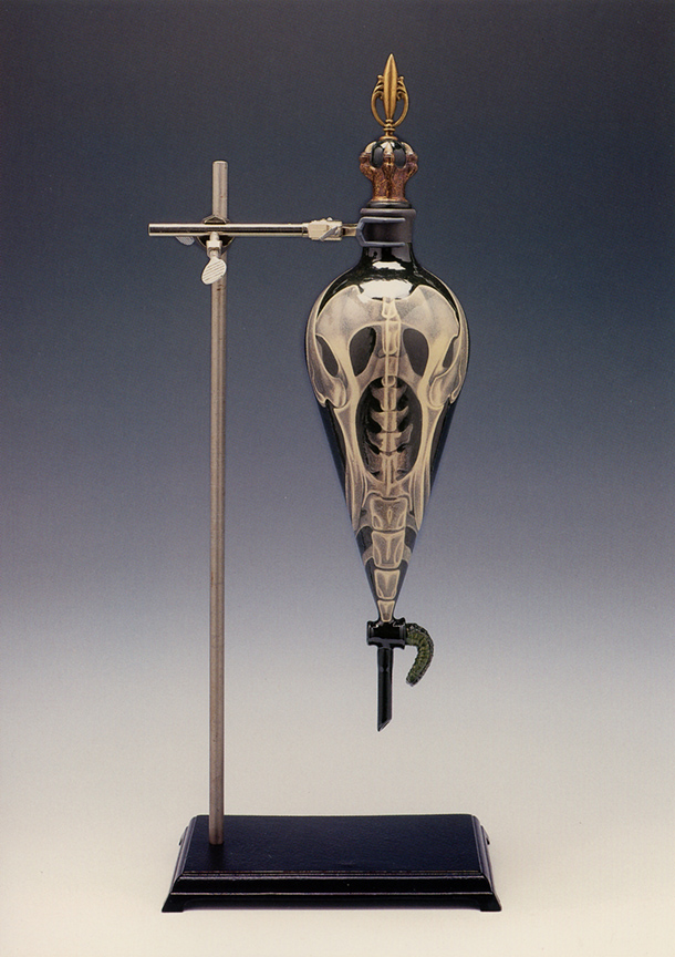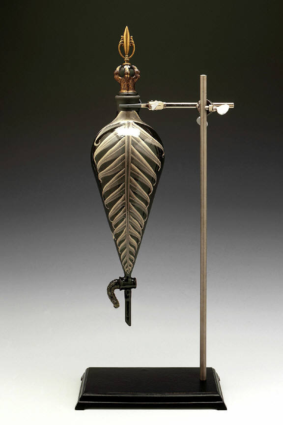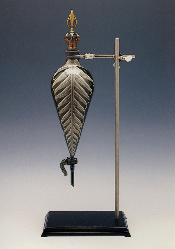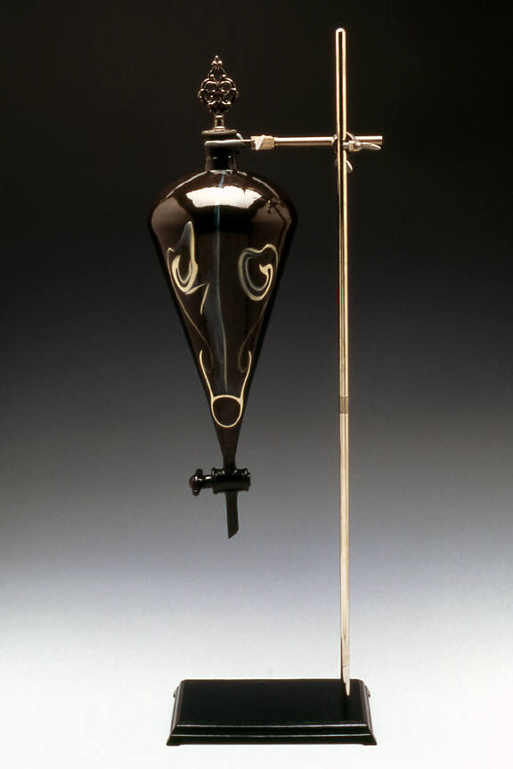 The new works are supported by the same stands used in a classic chemistry lab. With base, adjustable rod, and clamp, these armatures held separatory funnels in an earlier life. Now, transformed with automobile lacquers and other industrial finishes, they are scaffold and clasp for specimens in a strange brew. Not content to alter the glass equipment alone, the artist adds finials to the stoppers and grafts amphibian tails onto the stopcocks.