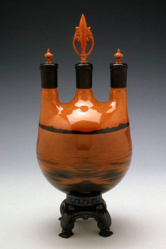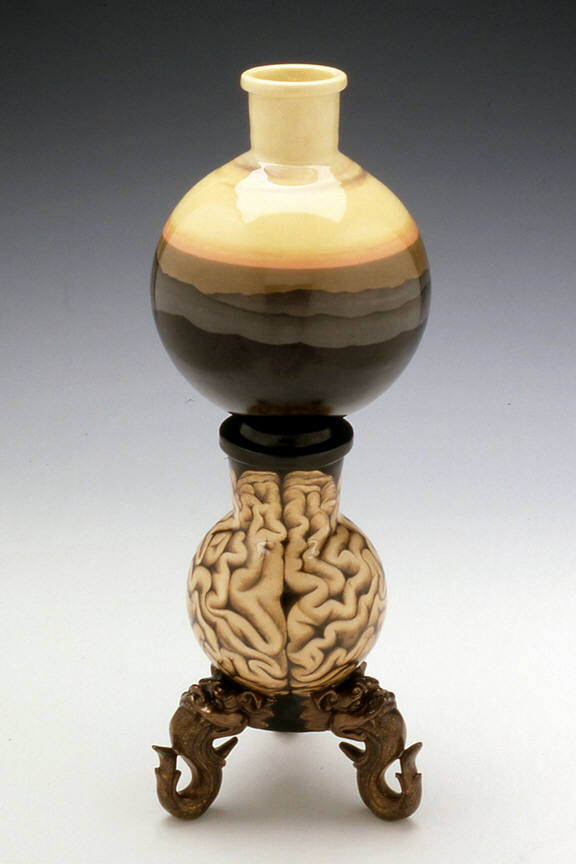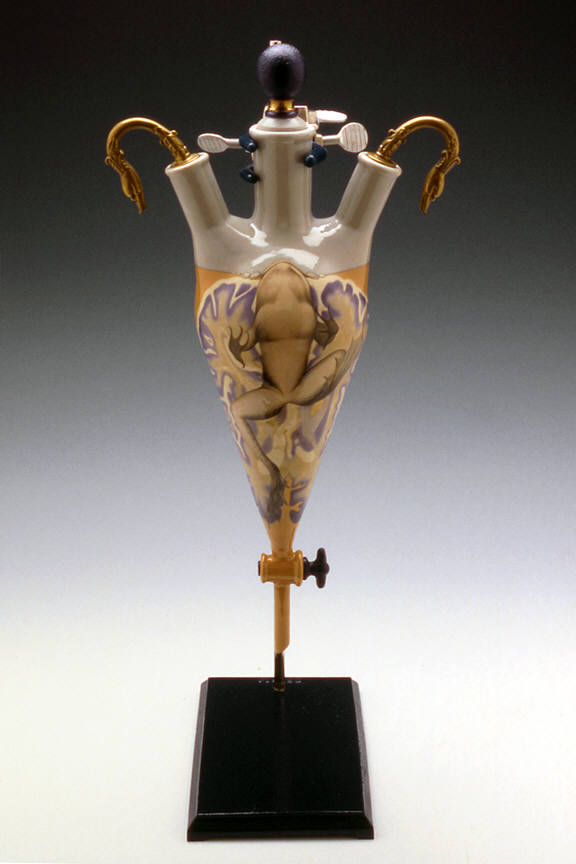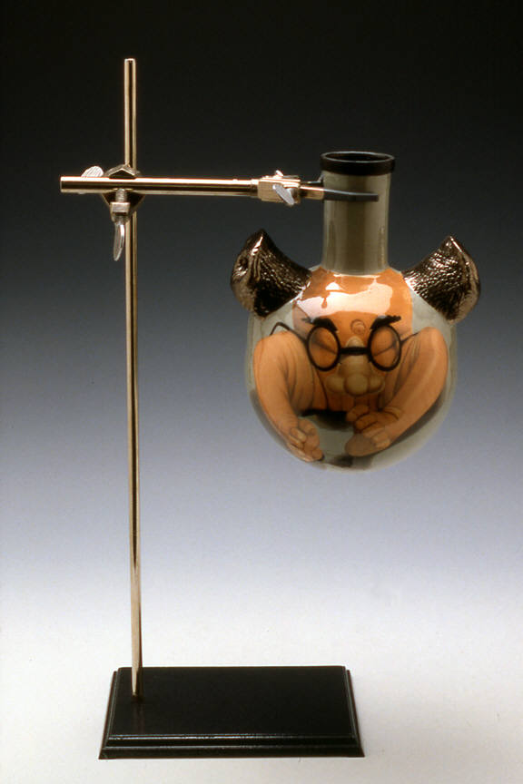 The works in "Specimens" mark a major breakthrough for Cindy Kolodziejski. In her previous pieces, the familiar domestic vessel (vase, tureen, or teapot) was transformed by the addition of unusual narrative imagery that often juxtaposed incongruous themes. The forms were altered by the inclusion of strange feet and handles, or the grafting of Victorian finials above a vase with a claw-footed base. In this show of seven new works, however, the artist has used the forms of vintage laboratory equipment to display foreboding and disturbing new images. Where she once presented more conventional ceramic vessels with provocative pictures, Kolodziejski's images now seem to be contained in a laboratory beaker of the mind.