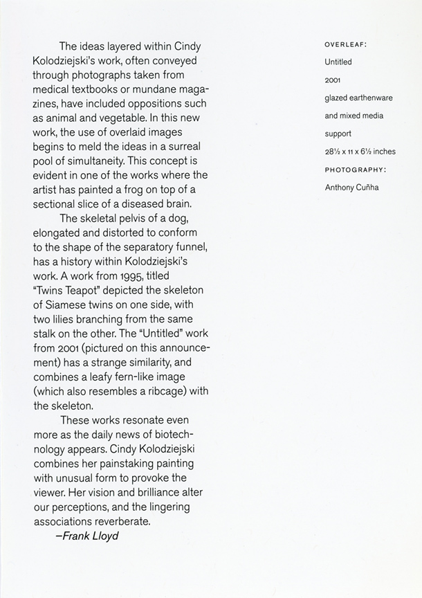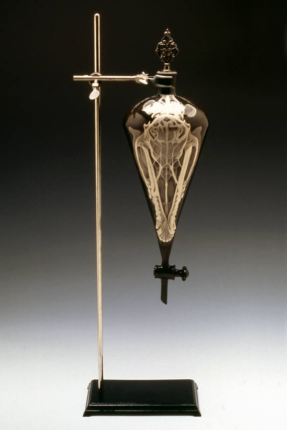 The skeletal pelvis of a dog, elongated and distorted to conform to the shape of the separatory funnel, has a history within Kolodziejki's work. A work from 1995, titled "Twins Teapot" depicted the skeleton of Siamese twins on one side, with two lilies branching from the same stalk on the other. The "Untitled" work from 2001 (pictured on this announcement) has a strange similarity, and combines a leafy fern-like image (which also resembles a ribcage) with the skeleton.
