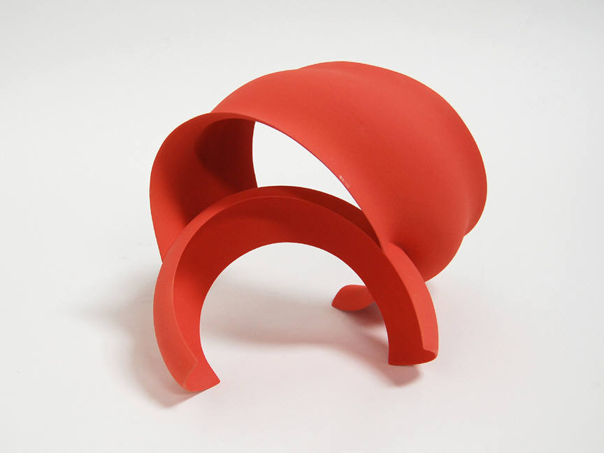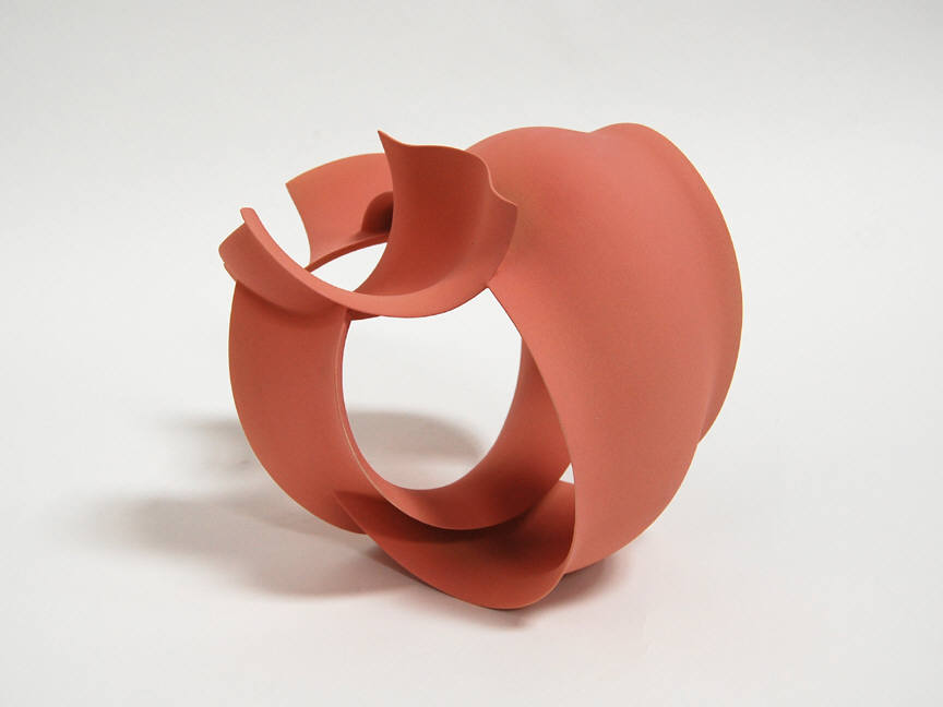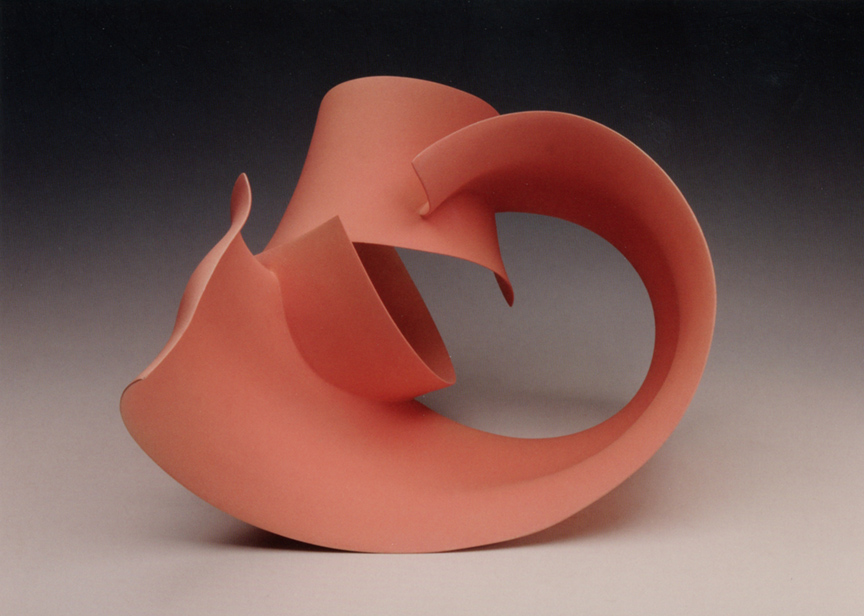 Dam's work demonstrates a remarkable ability to combine sleek and undulating ceramic forms with soft and sensual color. He states that "the colors are bold, chosen to strongly enhance the shape." He fuses planes and bulges, creating a compact small sculpture that has equal interest in interior and exterior form. The work seems to spring from several sources: classical vase form, reductive abstraction, and the natural world. The result is a marvelous and minimal blend of these things, a simple and elegant architecture.