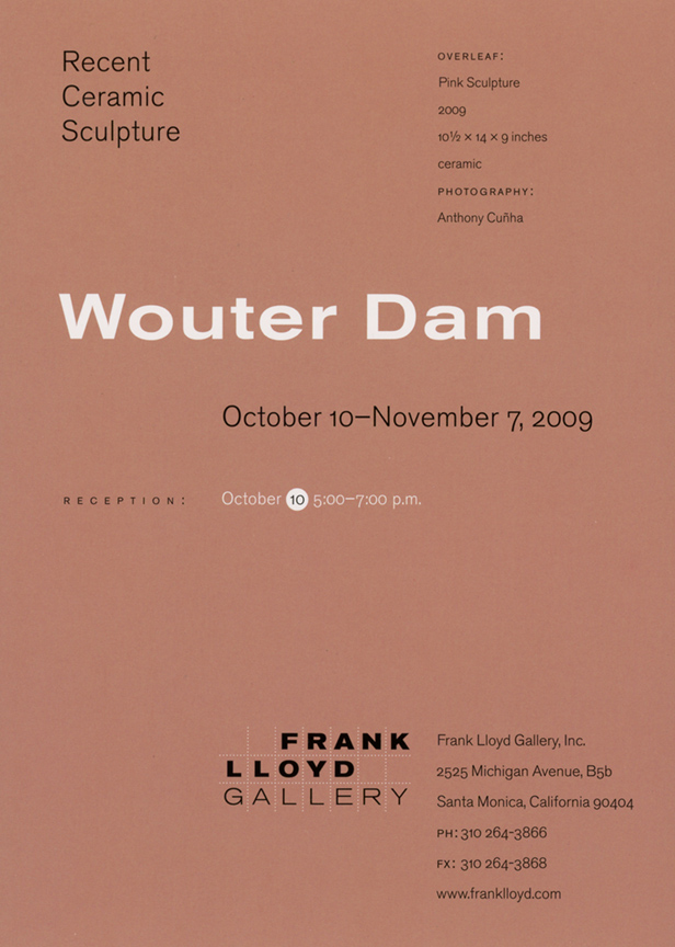This will be Wouter Dam's fifth solo show in Los Angeles. The artist was born in 1957 in Utrecht, the Netherlands. He studied at the Gerrit Rietveld Academie, Department of Ceramics. His work has been exhibited widely throughout the world, including Germany, Japan, France and his native Holland. His work is in the collection of the Victoria and Albert Museum in Holland, the Stedelijk Museum in Amsterdam, the Musee des Arts Decoratif in Paris, and the Detroit Institute of Art.