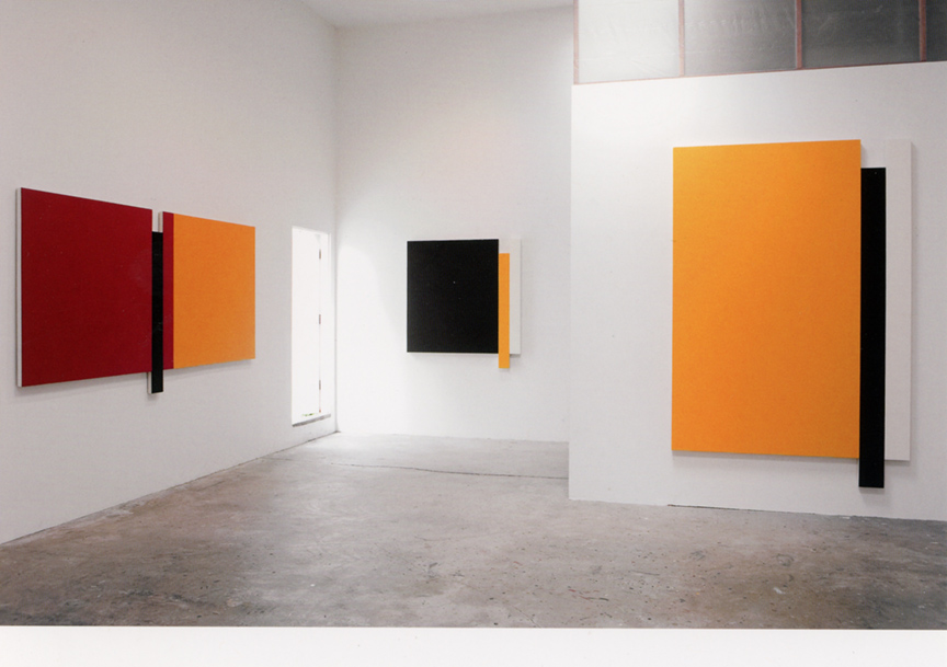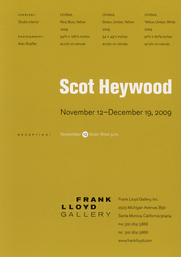 New paintings focusing on geometric planes of color and the interaction of refined surface techniques are the subject of Scot Heywood's exhibit at Frank Lloyd Gallery. In the evolution of abstract painting and sculpture, the use of geometric form with a limited palette is widespread, ranging from the Russian Suprematist compositions to minimal paintings.