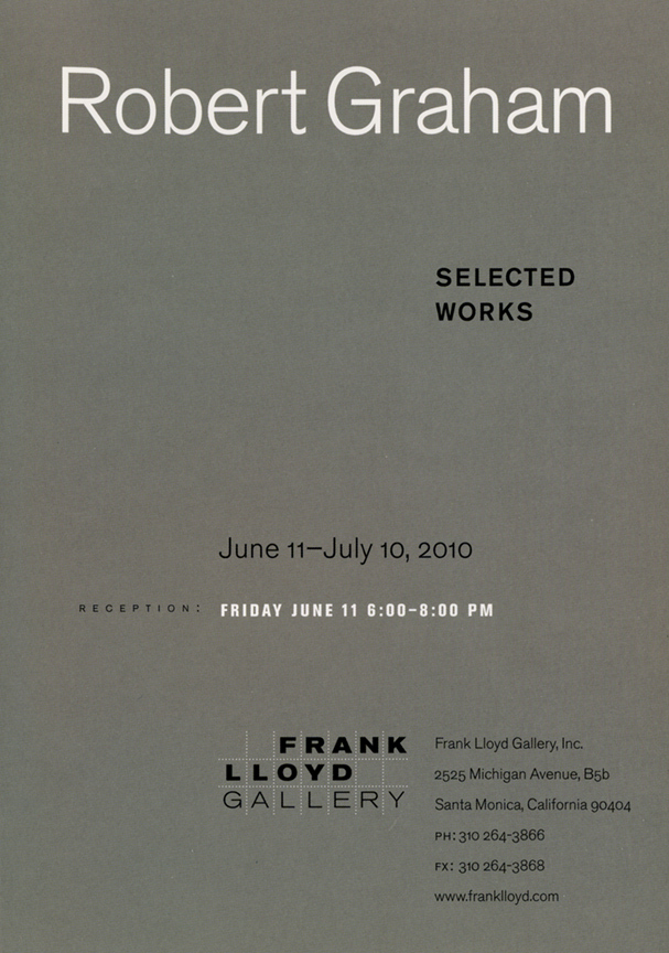 Robert Graham's sculptures, drawings and photographs are the subject of an exhibition at Frank Lloyd Gallery. The exhibition, organized and presented in cooperation with the Robert Graham Studio, will be the third time that Graham's work has been presented at the gallery. Graham, well known for his monumental bronze sculptures and civic monuments, worked in a variety of mediums, including studies in cast bronze, porcelain, Polaroid and digital photographs, and works on paper.