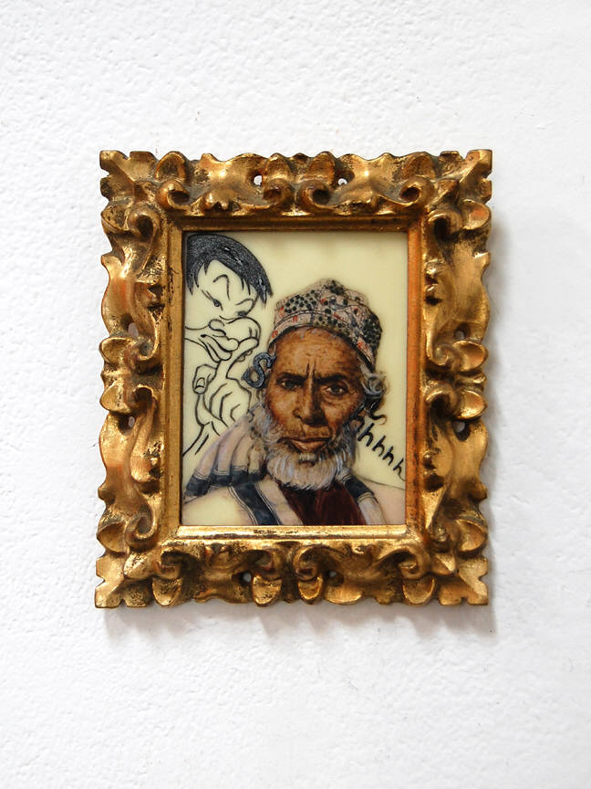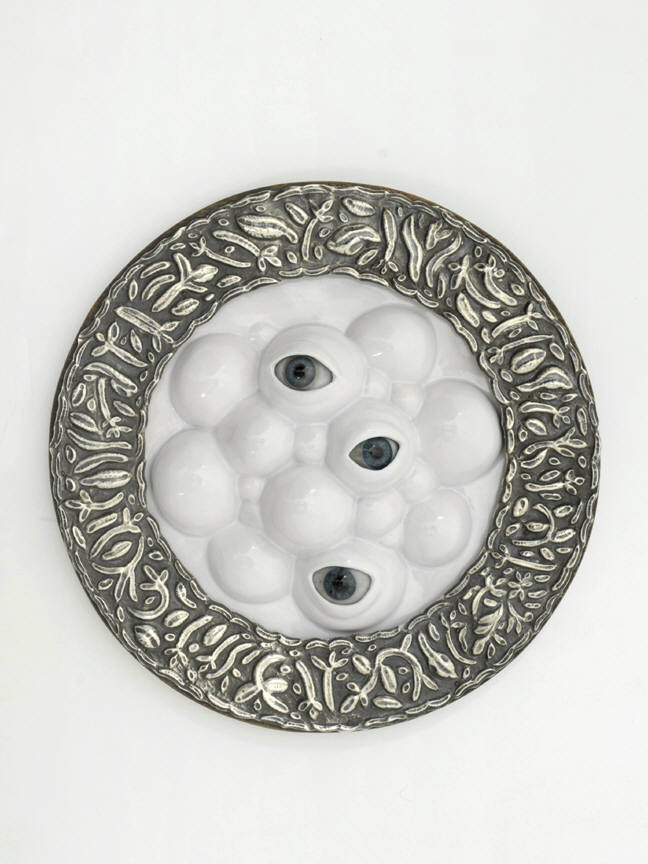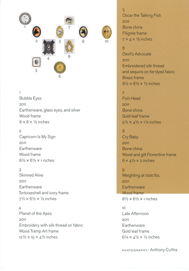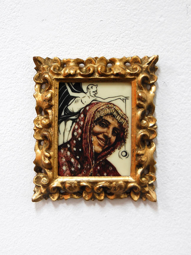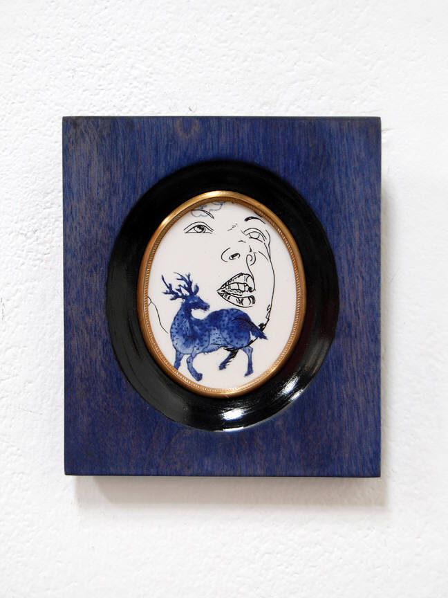 The Frank Lloyd Gallery is pleased to announce a solo exhibition by Cindy Kolodziejski. Known for her provocative imagery on ceramic vessels, Kolodziejski has turned to framed portraits and strange images in a multitude of media for this show. While introducing a wide range of human and animal imagery, the artist now mounts her work in a variety of ornate, carved and gilded frames. Kolodziejski continues to explore oddities, distorted views, and the fertile territory of human interaction. Ranging from pictures of odd fish on the ceramic support of bone china, to embroidery with silk thread on fabric, the engaging gallery of portraits will be hung salon-style.