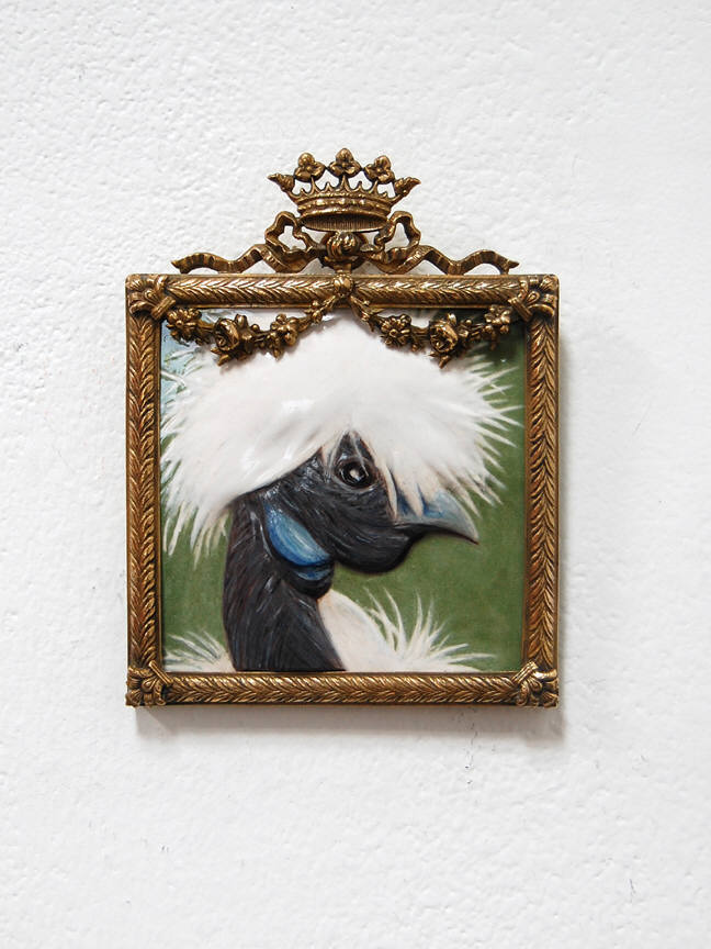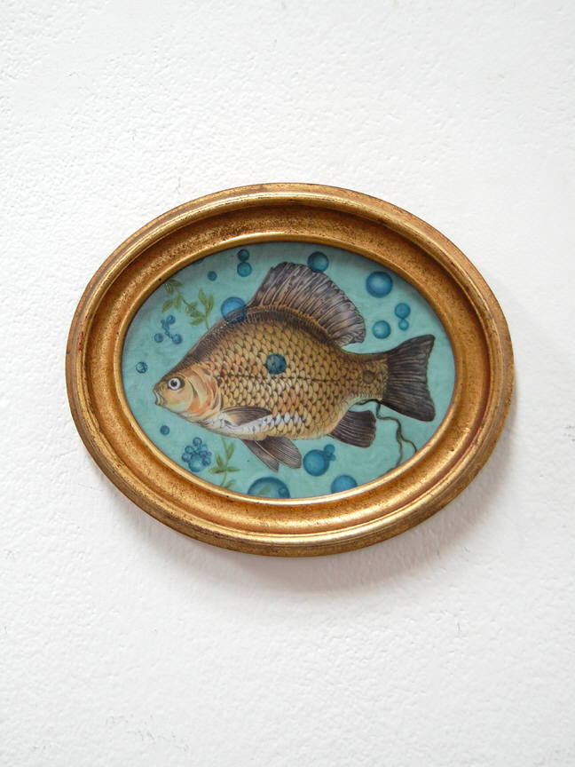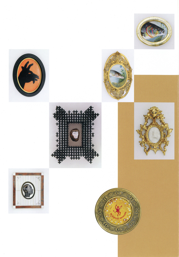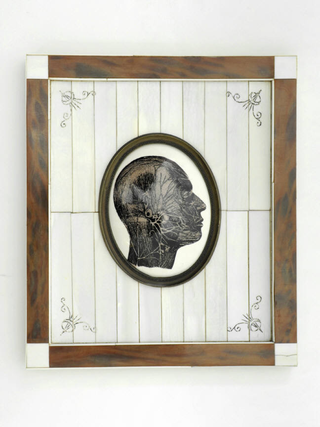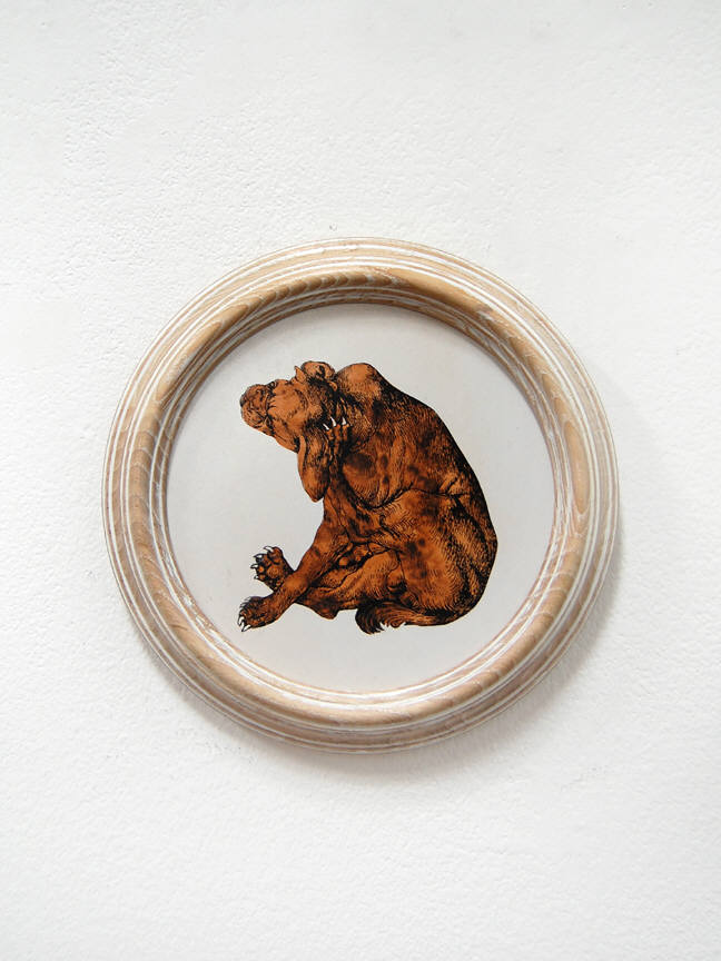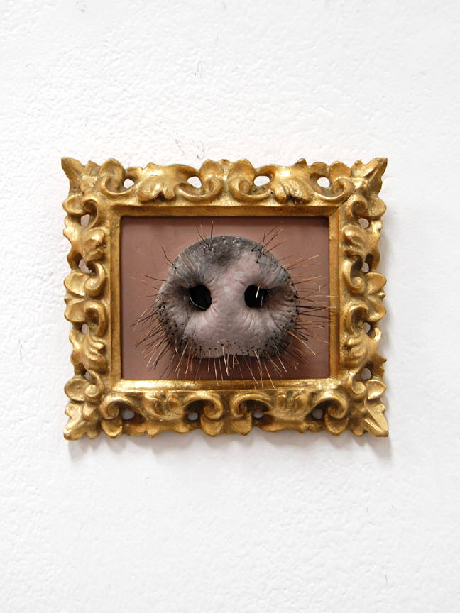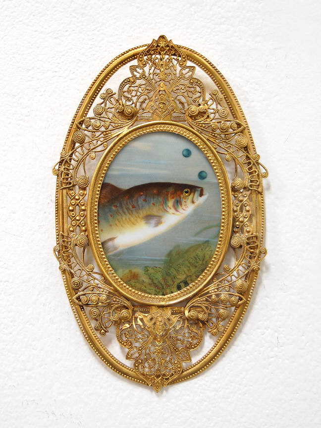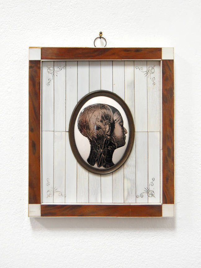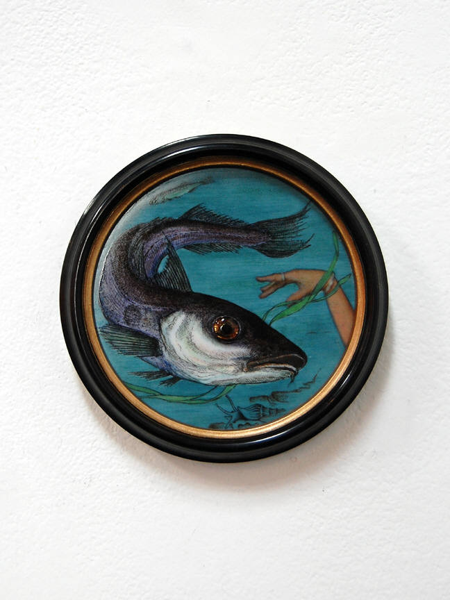 Cindy Kolodziejski previously made vessels by recombining and manipulating antique vessel forms, and meticulously painting her images. Kolodziejski's new work incorporates the animal world as well as startling shots of flayed skin and human jokers. The antique frames add layers of age and metaphor. The artist entices the viewer by intimacy of scale—enclosing the portraits in the manner of cherished mementos. Thus, Kolodziejski sets up an unusual tension. There are mixed references to animals, fish, and human interactions with the natural world.
