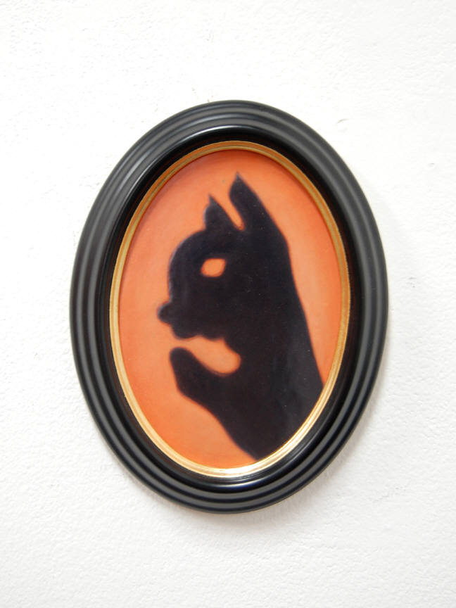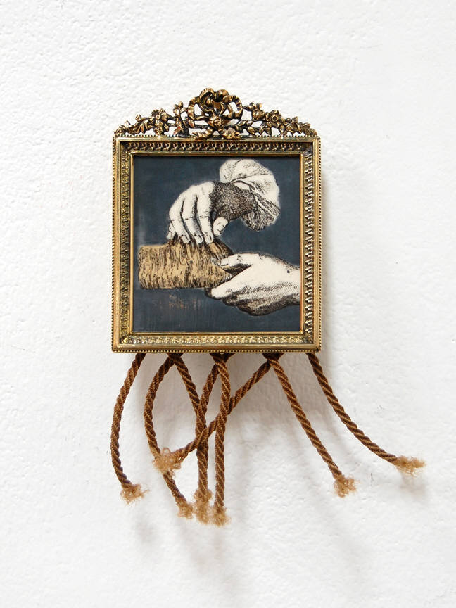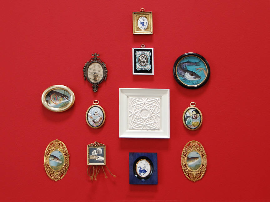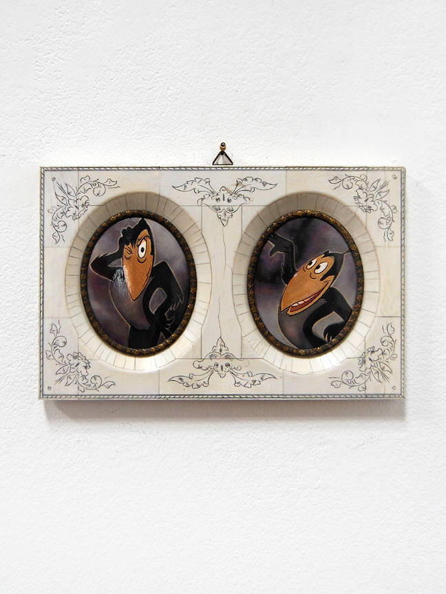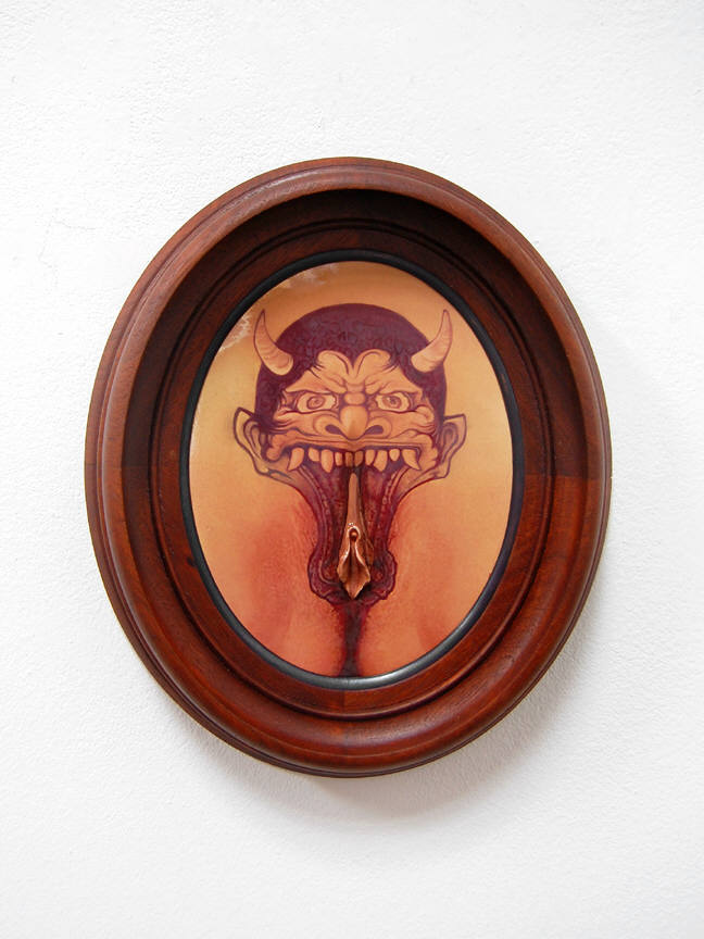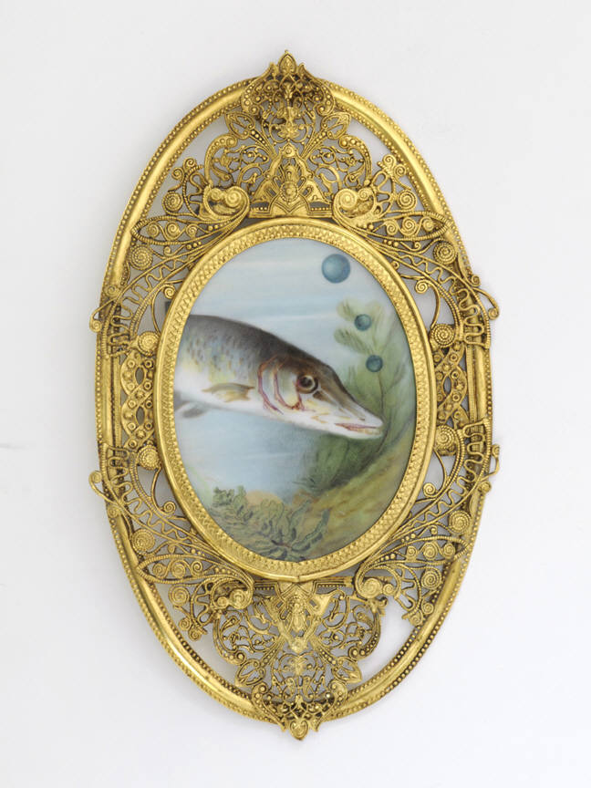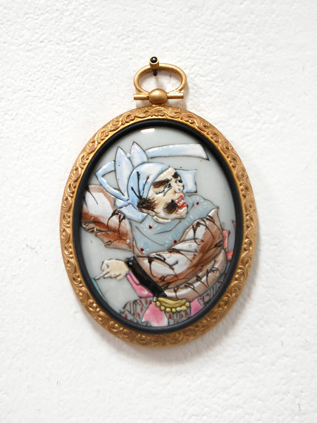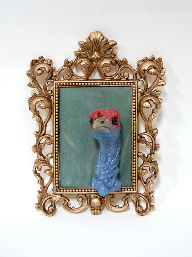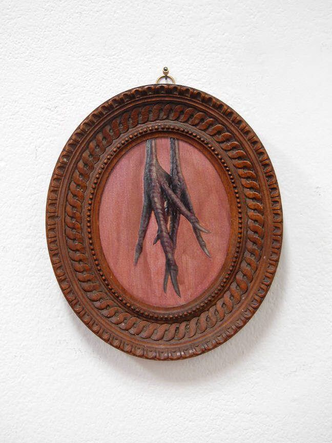 Cindy Kolodziejski previously made vessels by recombining and manipulating antique vessel forms, and meticulously painting her images. Kolodziejski's new work incorporates the animal world as well as startling shots of flayed skin and human jokers. The antique frames add layers of age and metaphor. The artist entices the viewer by intimacy of scale—enclosing the portraits in the manner of cherished mementos. Thus, Kolodziejski sets up an unusual tension. There are mixed references to animals, fish, and human interactions with the natural world.