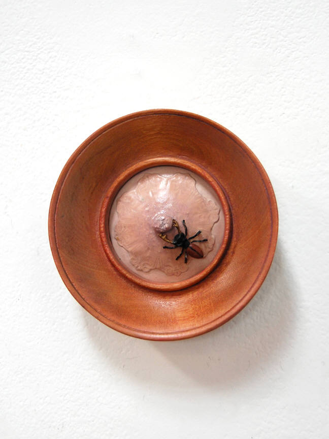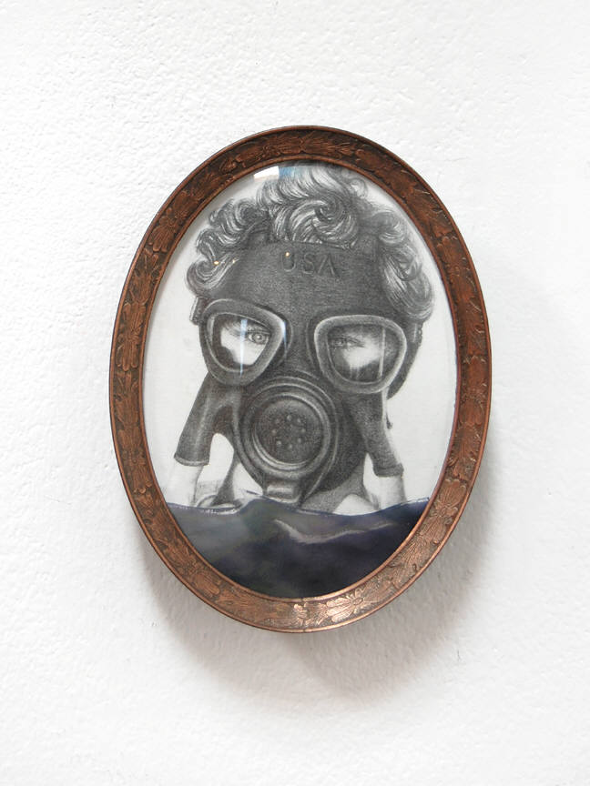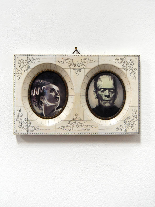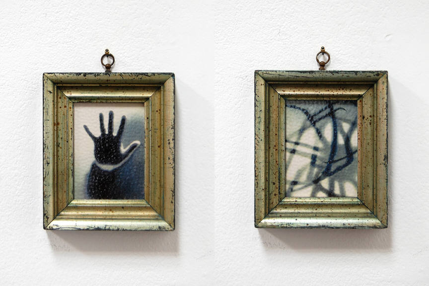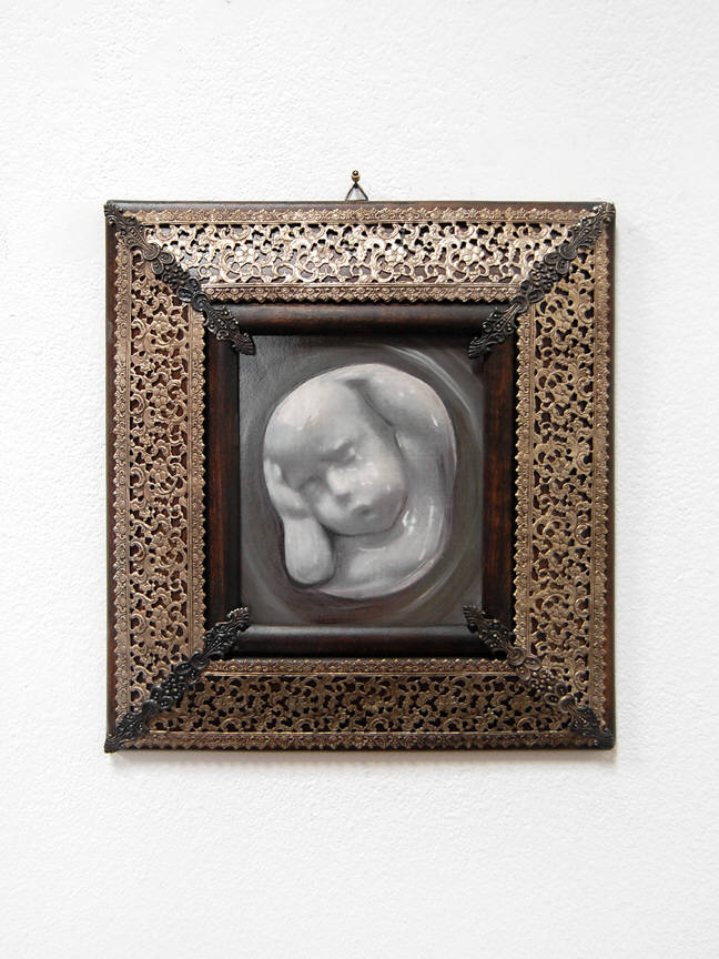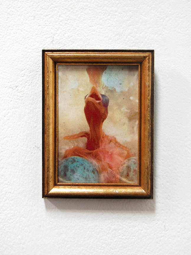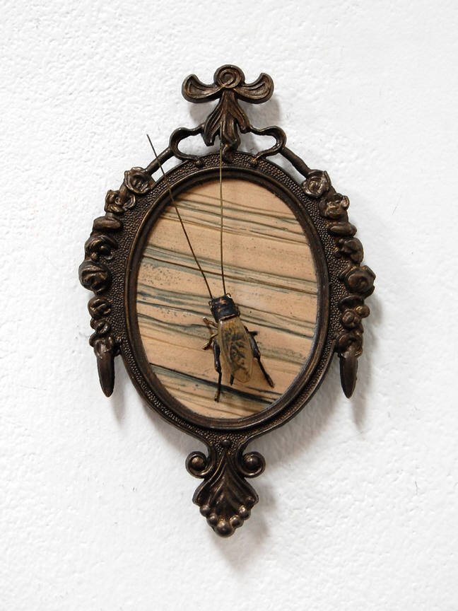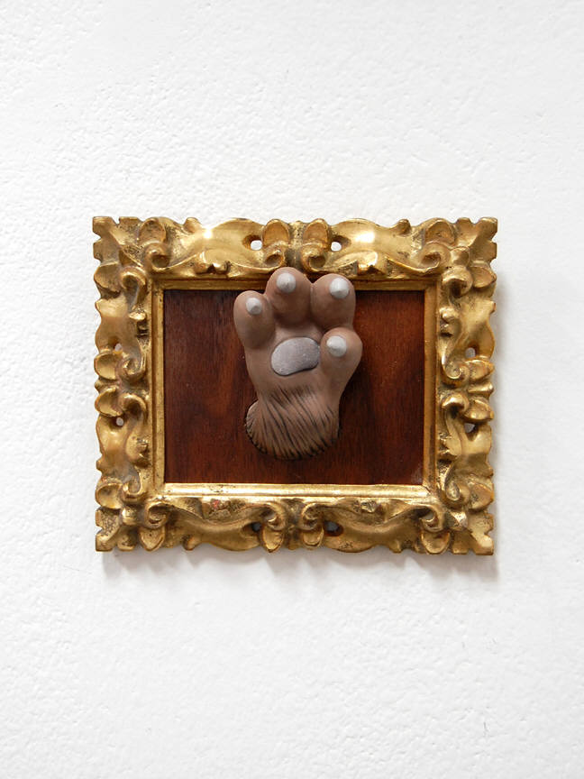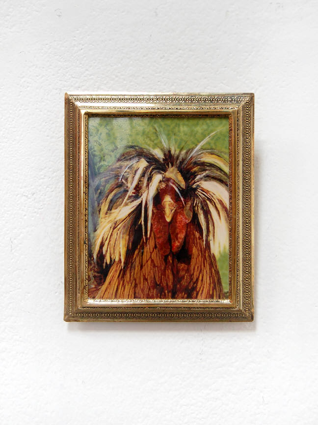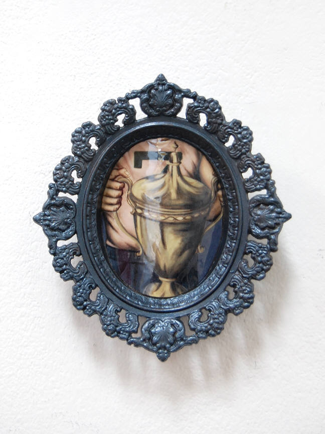 Cindy Kolodziejski previously made vessels by recombining and manipulating antique vessel forms, and meticulously painting her images. Kolodziejski's new work incorporates the animal world as well as startling shots of flayed skin and human jokers. The antique frames add layers of age and metaphor. The artist entices the viewer by intimacy of scale—enclosing the portraits in the manner of cherished mementos. Thus, Kolodziejski sets up an unusual tension. There are mixed references to animals, fish, and human interactions with the natural world.
