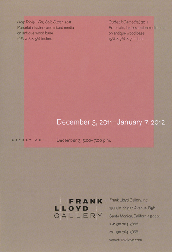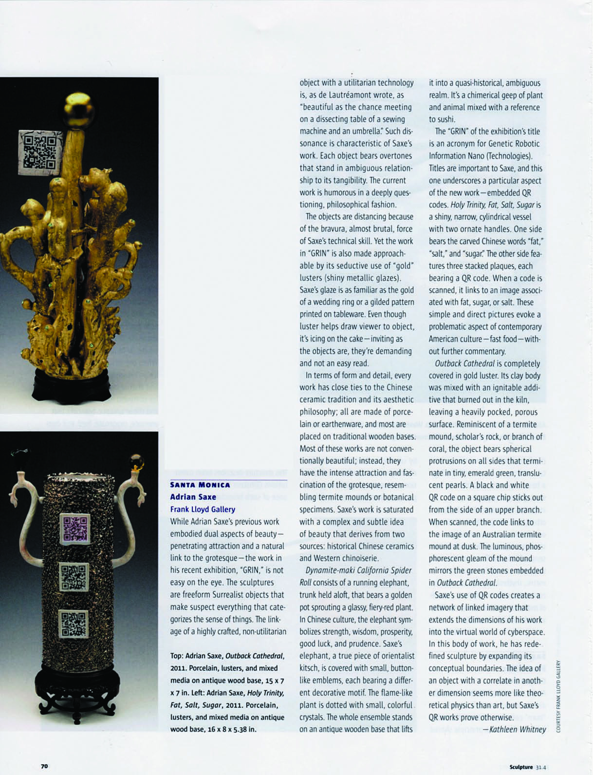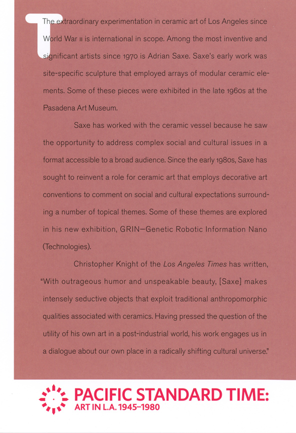 The extraordinary experimentation in ceramic art of Los Angeles since World War II is international in scope. Among the most inventive and significant artists since 1970 is Adrian Saxe. Saxe's early work was site-specific sculpture that employed arrays of modular ceramic elements. Some of these pieces were exhibited in the late 1960s at the Pasadena Art Museum.