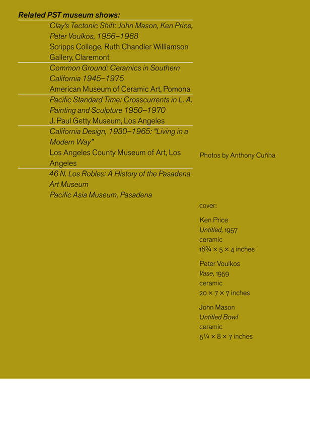 John Mason, Paul Soldner, Peter Voulkos, Ken Price, Billy Al Bengston, John Altoon, Ed Kienholz, Esteban Vicente, Henry Takemoto, and Michael Frimkess
