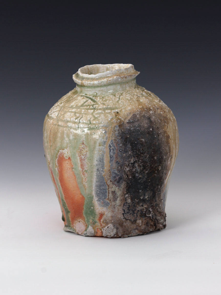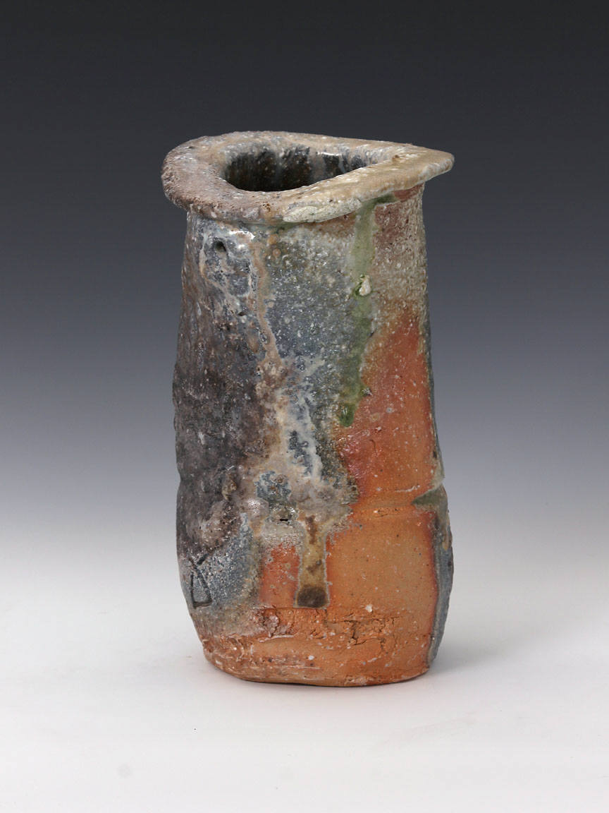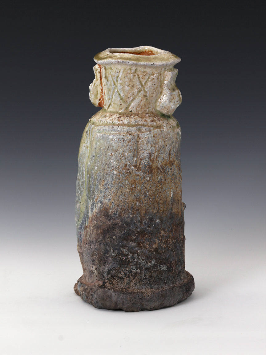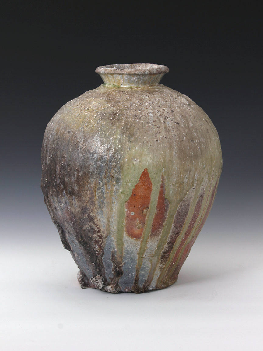 The sixteen ceramics in this exhibition range from a superb Iga Mizusashi (large lidded vessel essential to the Tea Ceremony) to flower vessels of widely varying shapes, sizes, and colors, from "Black Shigaraki" to "Glassy Green Iga." There are five works in the Shigaraki tradition, in which the pieces are fired for ten days at very high temperatures, and eleven works in the Iga tradition, in which pieces are fired for up to seven times for ten days. Each firing produces spectacular "natural glaze" effects. In both Shigaraki and Iga firings, the pieces go into the kiln completely unglazed: all the fabulous surface variations (seen here in two photographs) are solely the result of wood ash swirling around in the kiln and falling on the pieces, producing unpredictable and riveting effects achieved in no other Japanese ceramic tradition to such a degree.