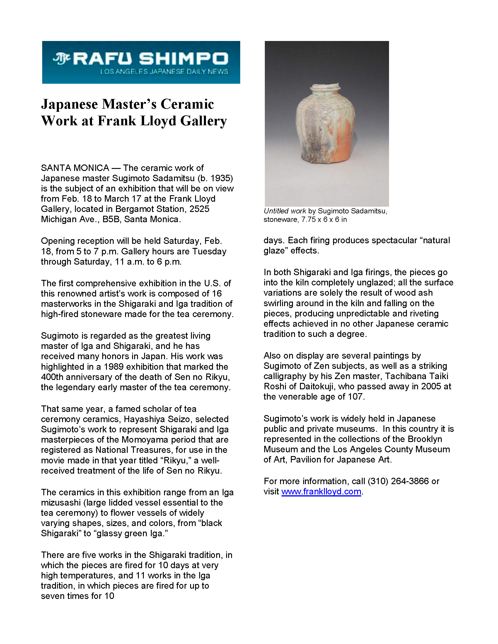 The ceramic work of Japanese master Sugimoto Sadamitsu (b. 1935) is the subject of an exhibition at the Frank Lloyd Gallery, opening February 18. The first comprehensive exhibition in the United States of this renowned artist's work, it is comprised of sixteen masterworks in the Shigaraki and Iga tradition of high-fired stoneware made for the Tea Ceremony.
