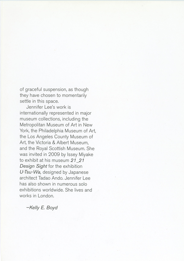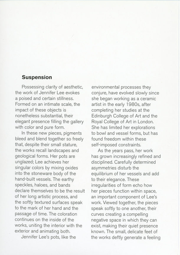 This exhibition will be Jennifer Lee's fourth solo show in Los Angeles. Her work is internationally represented in major museum collections, including the Metropolitan Museum of Art in New York, the Los Angeles County Museum of Art, and the Victoria & Albert Museum. Jennifer Lee was born in Aberdeenshire, Scotland, in 1956. She lives and works in London.
