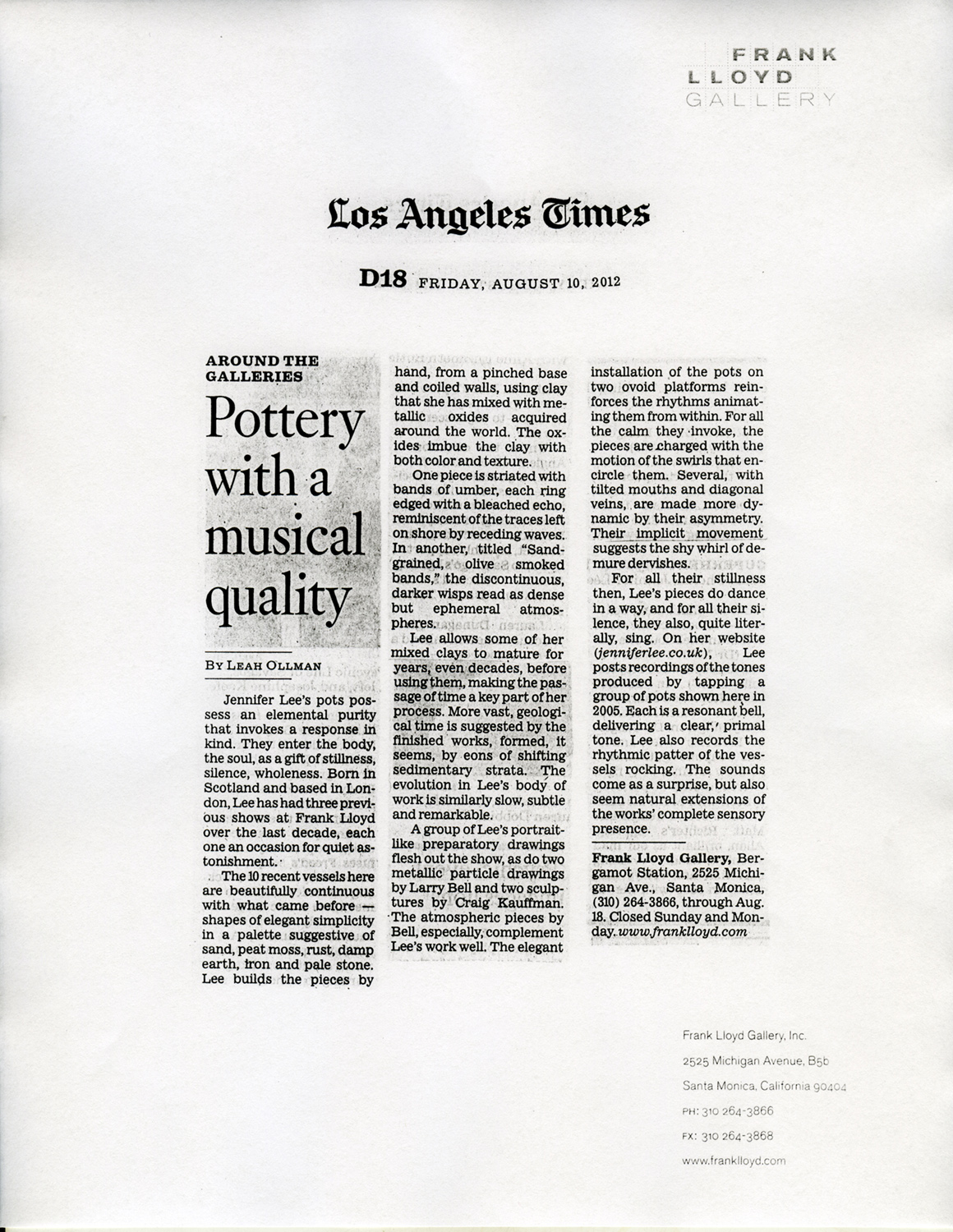 Lee's works have frequently been recognized for their kinship with landscape and geological forms. Indeed, Leah Ollman of the Los Angeles Times has written: "Breathtaking in their simplicity, they don't merely illustrate the conditions of nature but elegantly, gracefully manifest them."