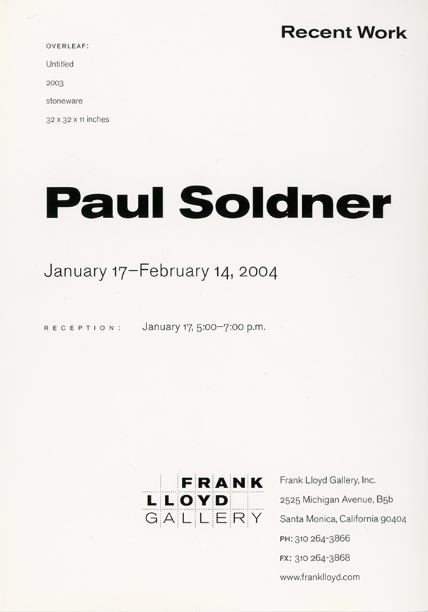 In conjunction with this exhibition, from January 24 through April 4 2004, the Williamson Gallery at Scripps College will host the 60th Ceramic Annual in honor of Paul Soldner. The annual, which is the longest running in the United States, will feature the work of Soldner, his students and his contemporaries.