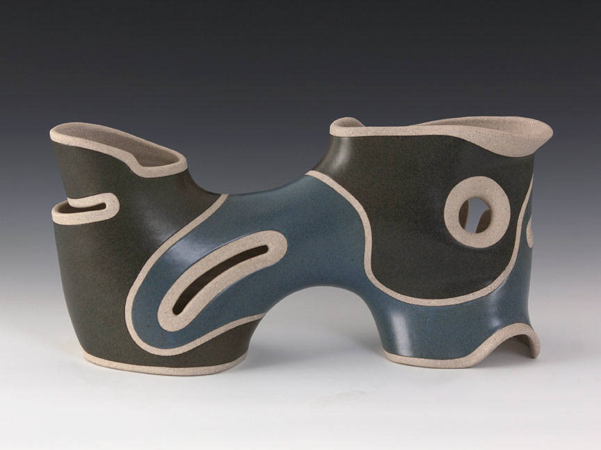 Japanese-American artist Akio Takamori will make another appearance, this time with one of his signature envelope vessels, as well as a small hanging sculpture, both from the 1980s. Sugimoto Sadamitsu, also from Japan, is regarded as a living master of the Iga style, and his work is highly regarded in his home country. Including both Iga and Shigaraki ware, his ceremonial ceramic objects are rugged in appearance, their coloration resulting from the accumulation of ash on their surfaces. Mexican artist Gustavo Pérez was also included in IHOC Part One, and is showing several of his more abstract pieces, which reference his earlier architectural vessels. Despite the change in form, Pérez's work remains recognizably his own.