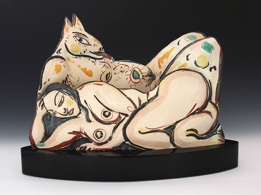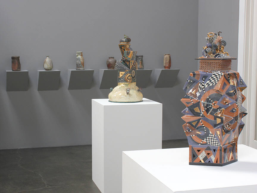 IHOC Part Two is completed with works by two more of our American artists. Ralph Bacerra's large covered vessels incorporate a variety of elaborate non-western techniques, and demonstrate his commitment to the beauty of the decorated ceramic surface. Finally, Adrian Saxe joins the exhibition for the second time, with a series of teapots from the Sèvres manufacture in France that riff on historical French ceramics.