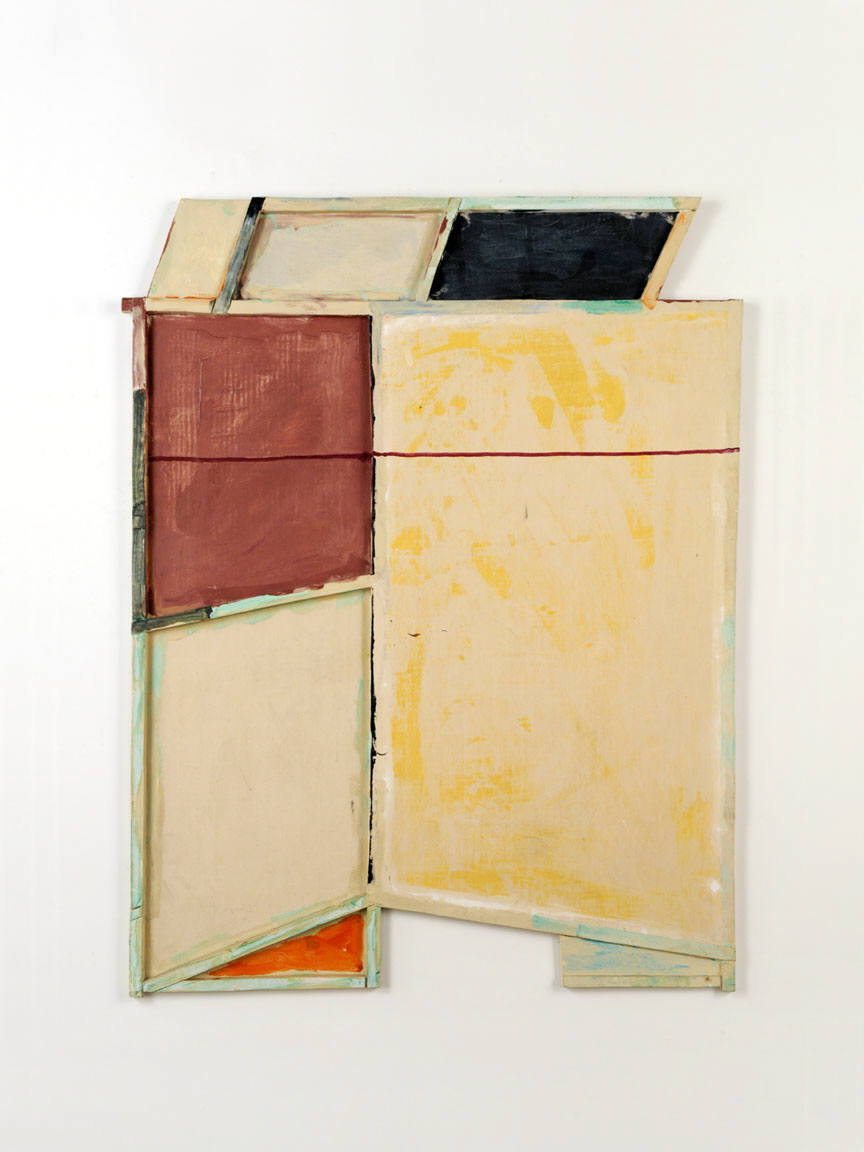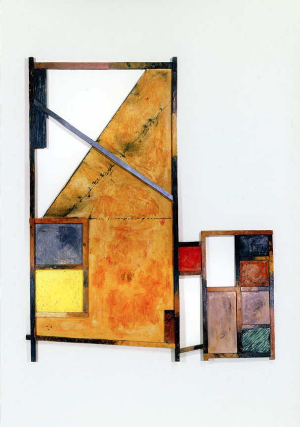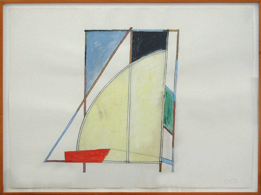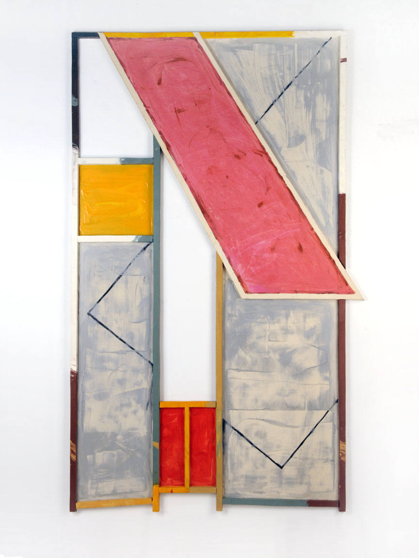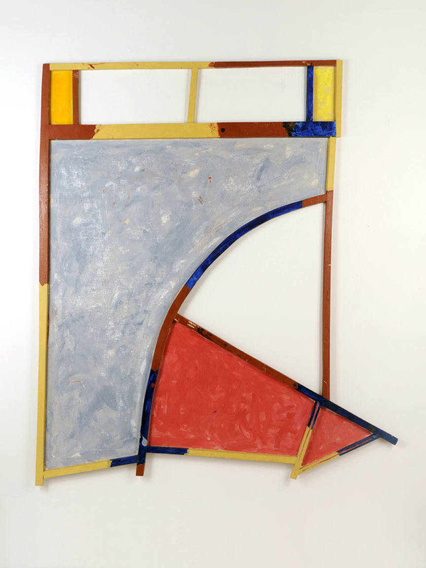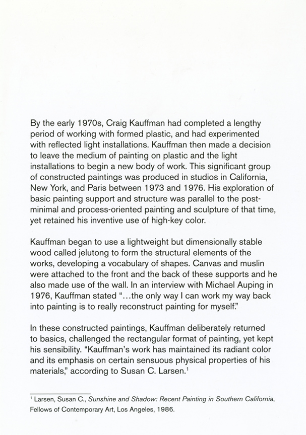 Craig Kauffman's previous plastic relief paintings were his most well-known work. In the constructed paintings of the 1970s, Kauffman deliberately returned to basics, challenged the rectangular format of painting, yet kept his sensibility. "Kauffman's work has maintained its radiant color and its emphasis on certain sensuous physical properties of his materials," according to Susan C. Larsen. 1 It is through his integration of color, linear structure and shape that he achieved the architectural presence of this series of constructed paintings.