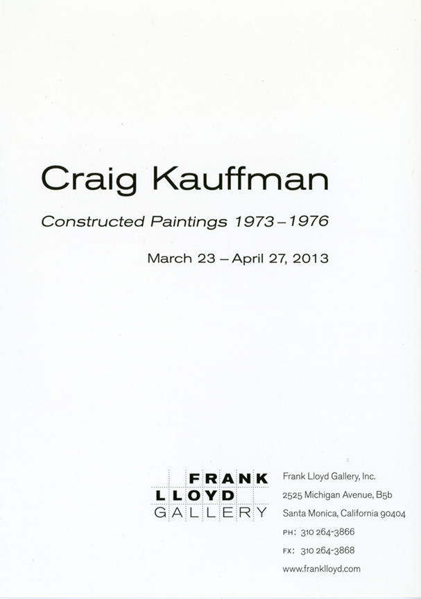 The Frank Lloyd Gallery is pleased to present an exhibition of Craig Kauffman's constructed paintings, made during the years 1973 to 1976. This significant group of works was produced in studios in California, New York, and Paris during a period of transition for the artist. His exploration of basic painting support and structure was parallel to the post-minimal and process-oriented painting and sculpture of that time, yet retained Kauffman's inventive use of high-key color. The works reflect Kauffman's life-long interest in unorthodox supports for painting, as well as a sensuous and luminous color sensibility.