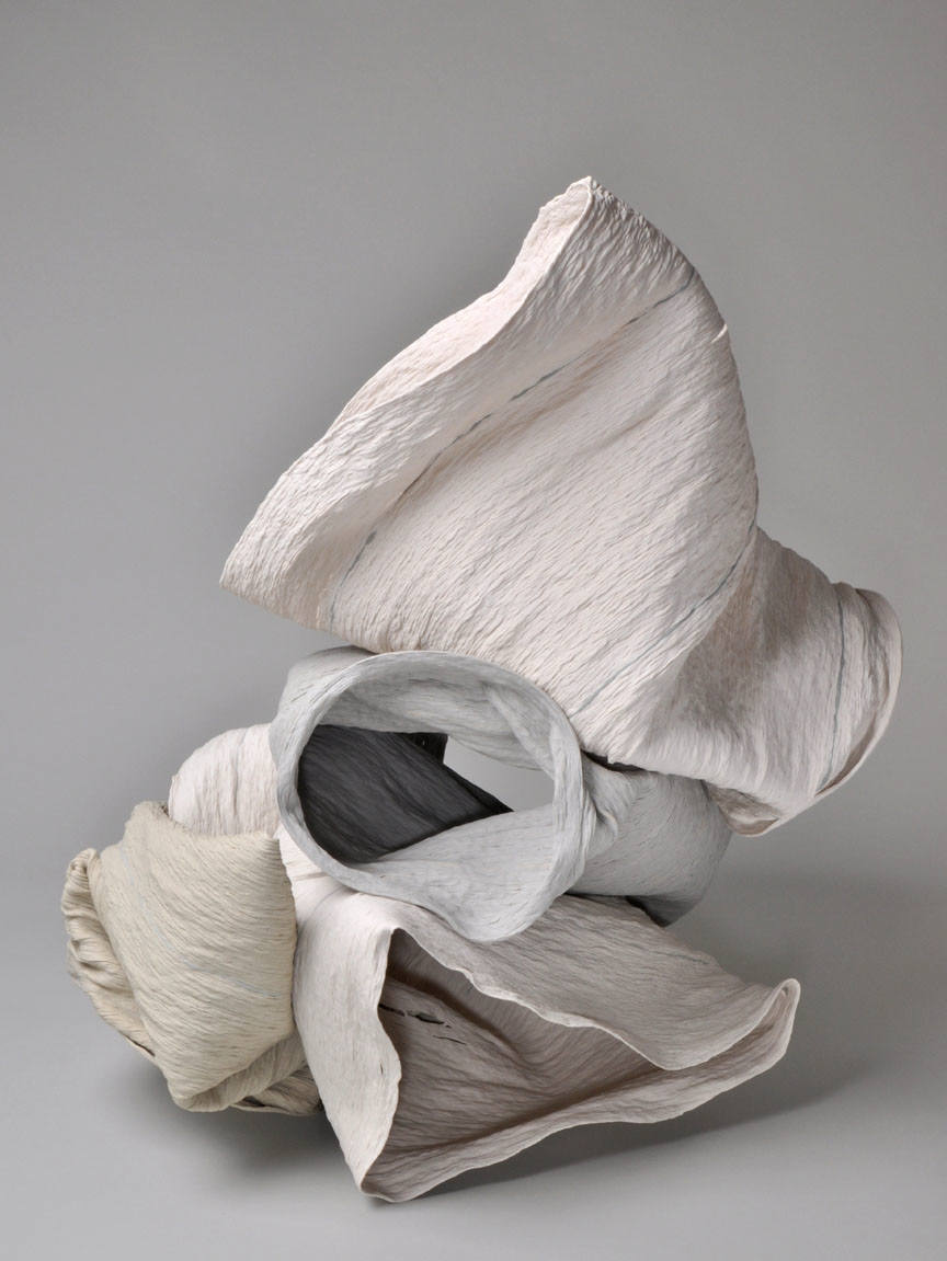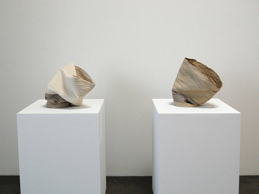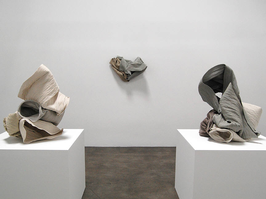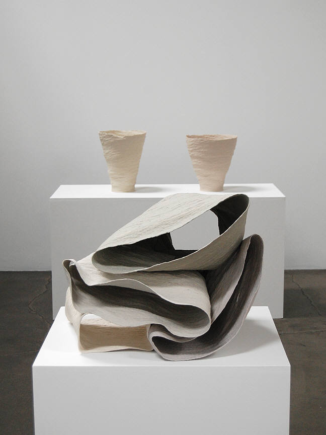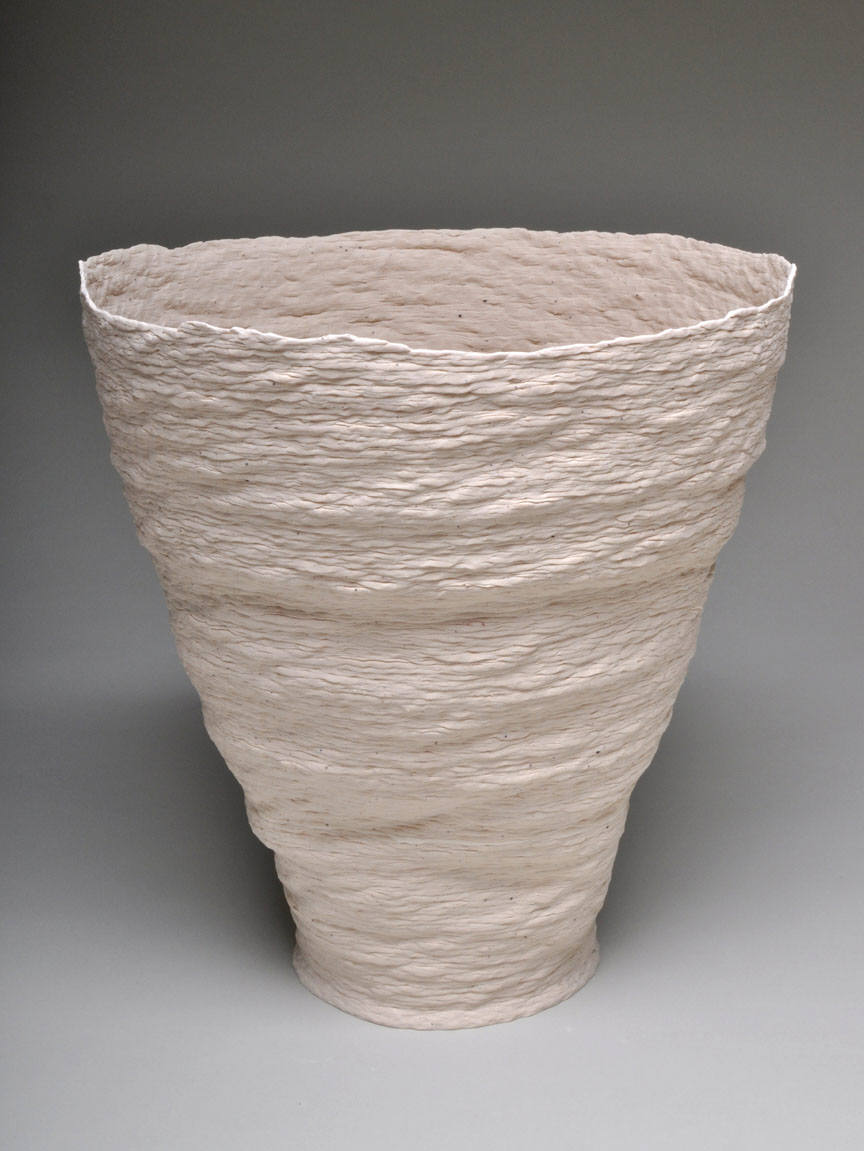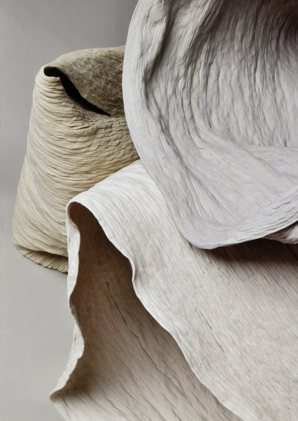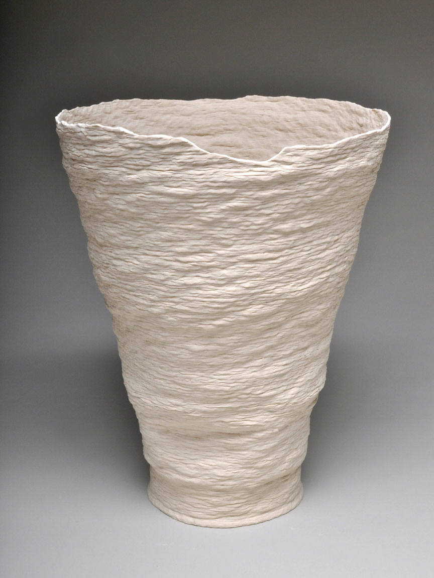 Thomas continues to form her work by coiling and pinching together impossibly thin strands of clay into vertical vessel forms. Rather than smoothing the ridges and furrows that characterize this process, she leaves the textured surface as a permanent record of her engagement with the material. When exposed to the heat of the kiln, the vessels soften or collapse unpredictably. It is by combining several collapsed vessels that she creates her larger sculptures, elegant and graceful compositions that are "exquisite and very delicate, richly open-ended in their associations," according to Constance Mallinson for Art in America.