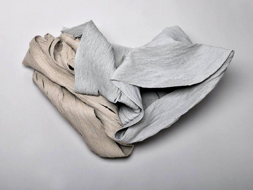 Thomas has recently introduced soft, subtle colors into her previously black and white body of work. These new pieces are constructed of gentle shades of blue, brown, gray, cream, and white. The light hues lend a soft-focus quality to her work and make their delicacy, already a defining characteristic, even more pronounced.