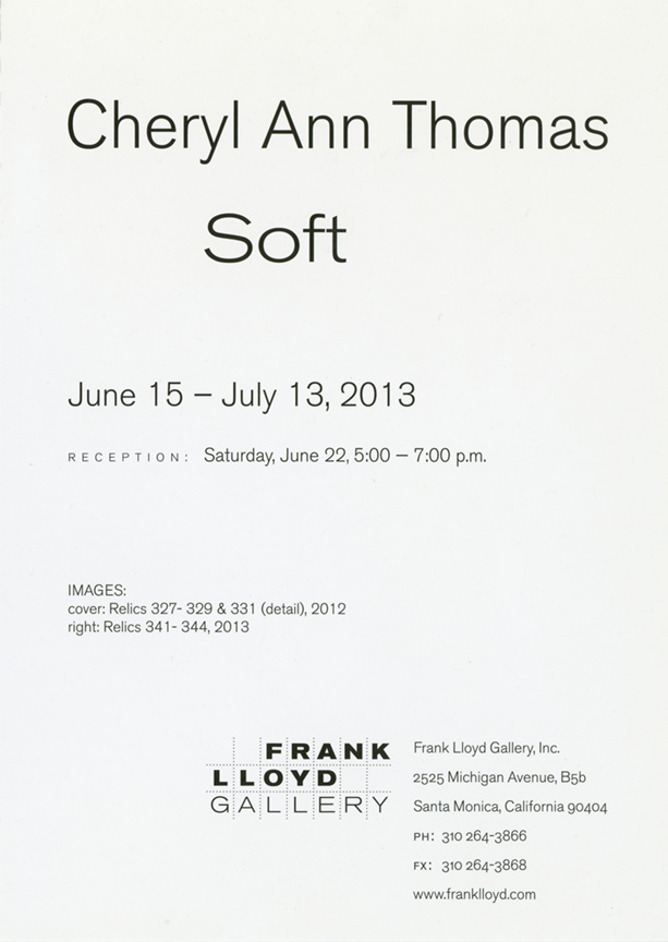 Cheryl Ann Thomas graduated from the Art Center College of Design in 1982, and has emerged as a ceramic sculptor within the past 13 years. She has been featured in solo and group shows in New York and Los Angeles and her work is included in the collections of the Long Beach Museum of Art, the Minneapolis Institute of Arts, and the Gardiner Museum in Toronto. This is her fourth solo exhibition with the Frank Lloyd Gallery.