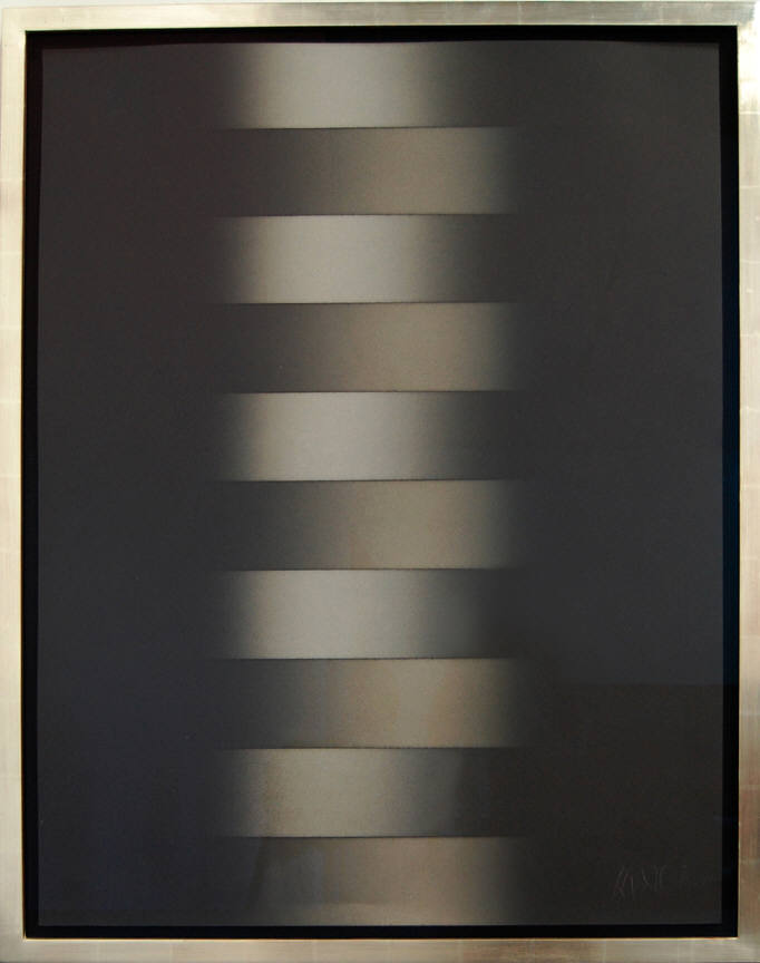 Polyform includes examples of Vapor Drawings by Larry Bell, and the works on display demonstrate the impact of repetition as a compositional device. Their horizontal planes have a geometric precision, while the subtle gradations of metallic particles move the eye rhythmically through the pieces. Like tapestries woven from light, the bands of these works interlace themselves into a cohesive image.