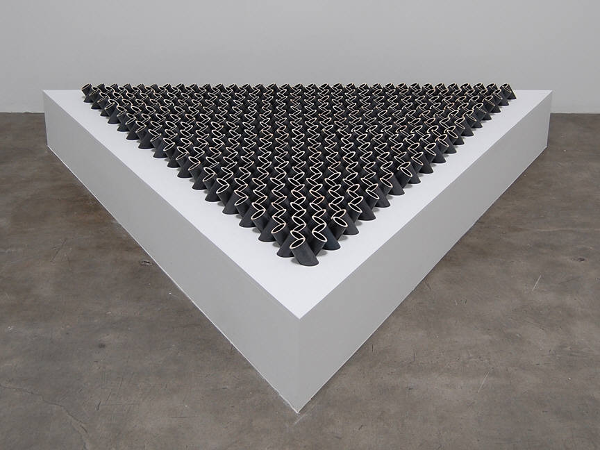 Mexican ceramic artist Gustavo Pérez is represented by a large-scale installation titled Triángulo. This piece is composed of dozens of small cylinders, each cut at a precise angle and placed in face-to-face opposition. The sculpture forms an equilateral triangle, based in geometry but simultaneously alluding to minimal art and optical illusion. Other examples of his works seem to be part architecture, part mathematical pattern, and part lyrical movement.