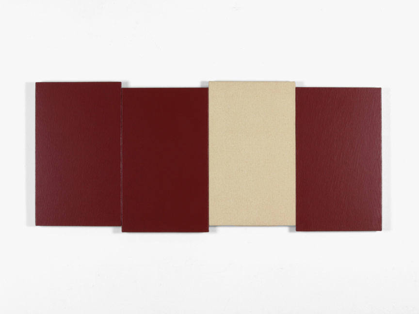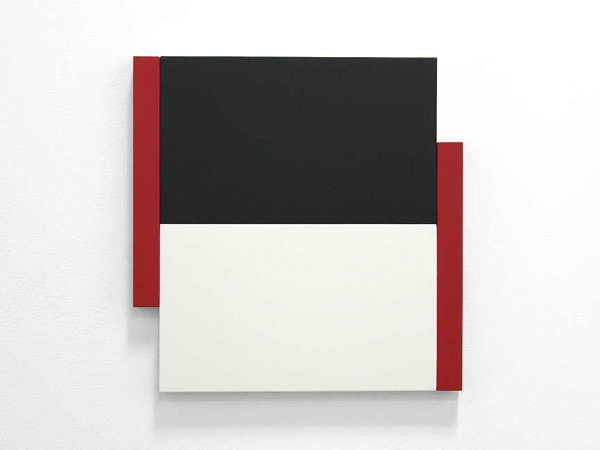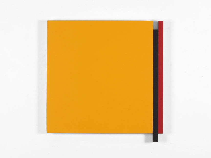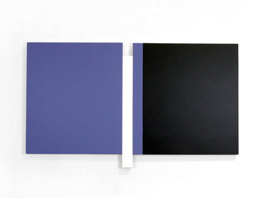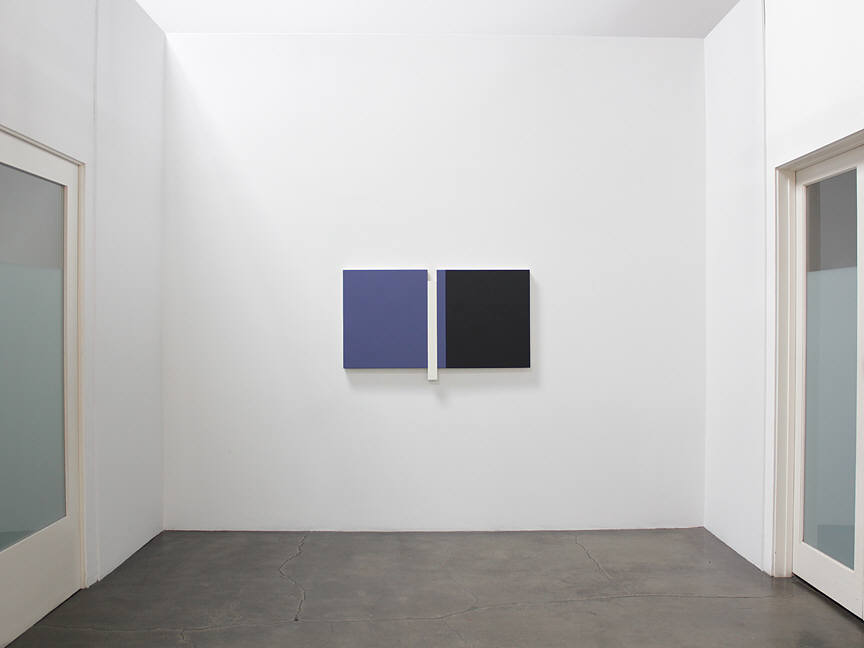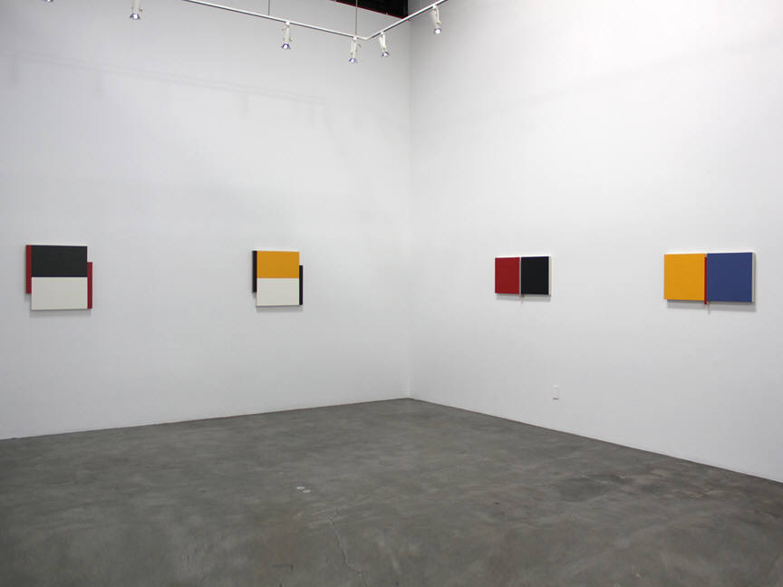 Small but unexpected asymmetries and careful "notches" disrupt the smooth rectangularity of the artist's wood and canvas surfaces, creating a dialogue between form and color that implicates the space of the gallery. The white walls of the gallery become incorporated into the works, functioning as negative space. The relationships between the walls, the works, and the viewers are all held up for examination.