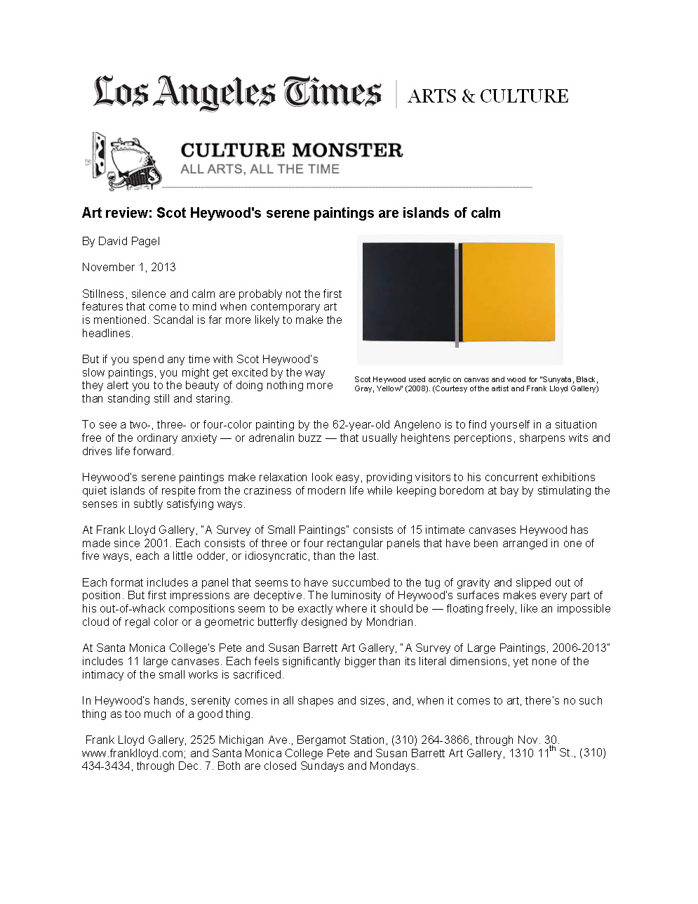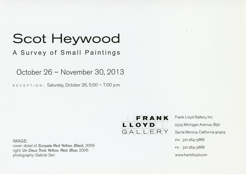 Scot Heywood has been exhibiting his work in Los Angeles since 1986, and this will be his third solo show at the Frank Lloyd Gallery. The show will be accompanied by a full-color catalog with an essay by Frances Colpitt. Heywood's work was recently included in the group exhibit, Marks and Movement: Five Painters, as well as over two dozen significant group exhibits, and is represented in the collection of the Frederick Weisman Foundation.