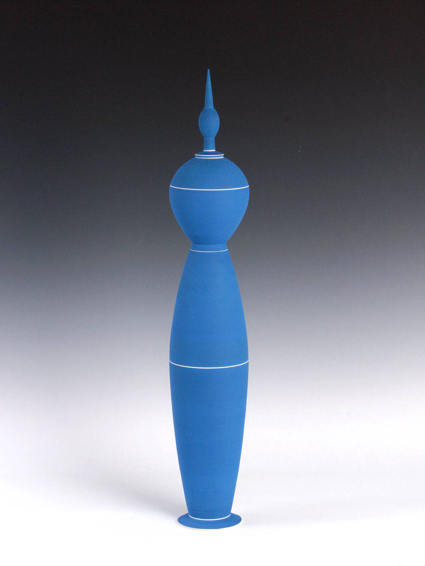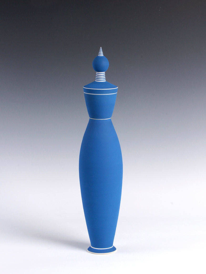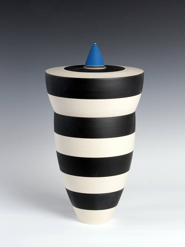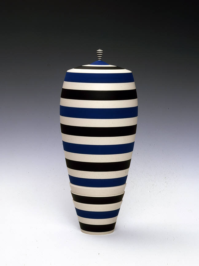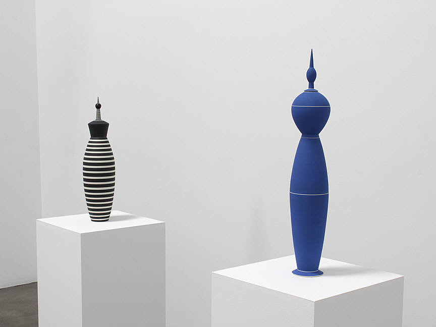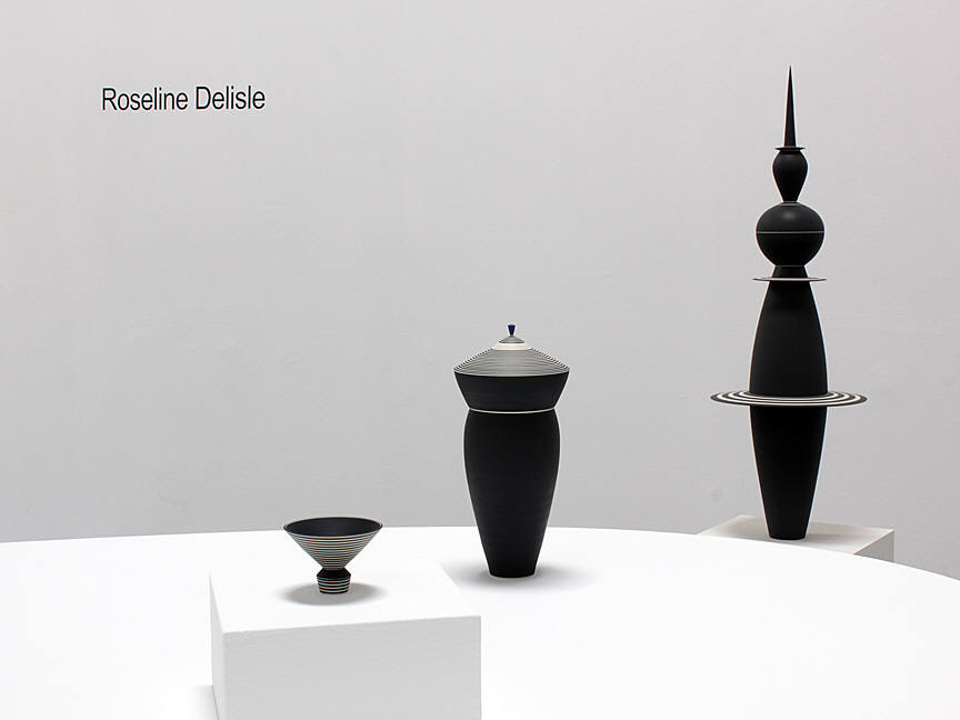 This exhibition will include a selection of work produced in the 1980s and 90s, illustrating the artist's move towards progressively larger forms. Although most of her early work was made in the demanding medium of fired porcelain, Delisle turned to an earthenware clay body to accommodate her desire to build larger-scale figurative pieces. Her largest works are composed of several pieces, which stack together seamlessly. The work was formed and decorated on the wheel, the fundamental basis of Delisle's practice. Horizontal striping in black, white, and blue both accentuates and disrupts the smooth proportions of her wheel-thrown forms. Referring to Delisle's work, McKenna also wrote that "As aesthetic forms, they're structured around a number of oppositions: profile versus surface; vertical thrust versus horizontal stripe; order versus whimsy; color versus form. Perhaps most important, what they do is take another opposition – art versus craft – and skewer it with wit and shocking grace."