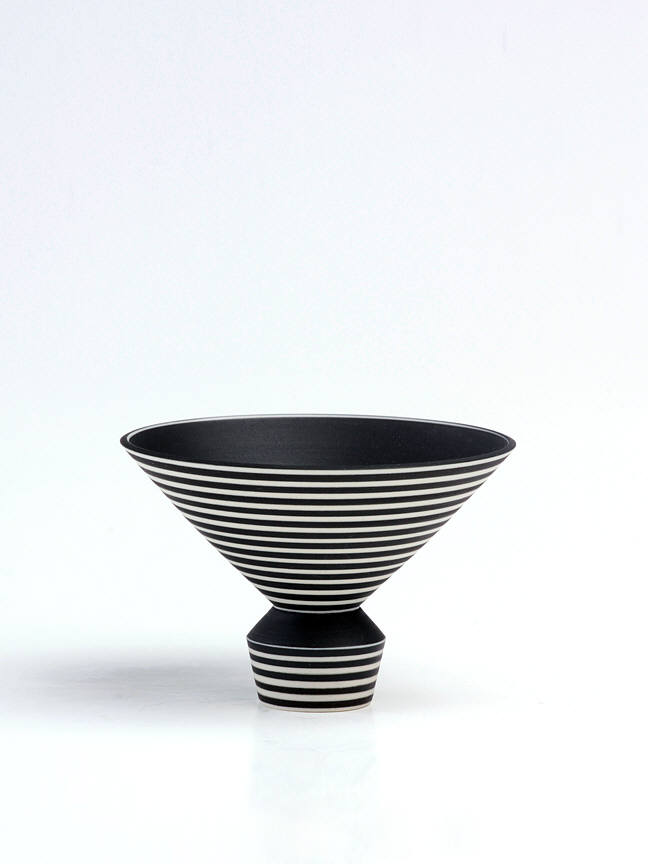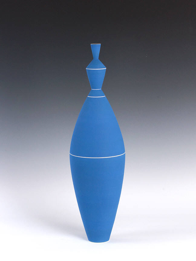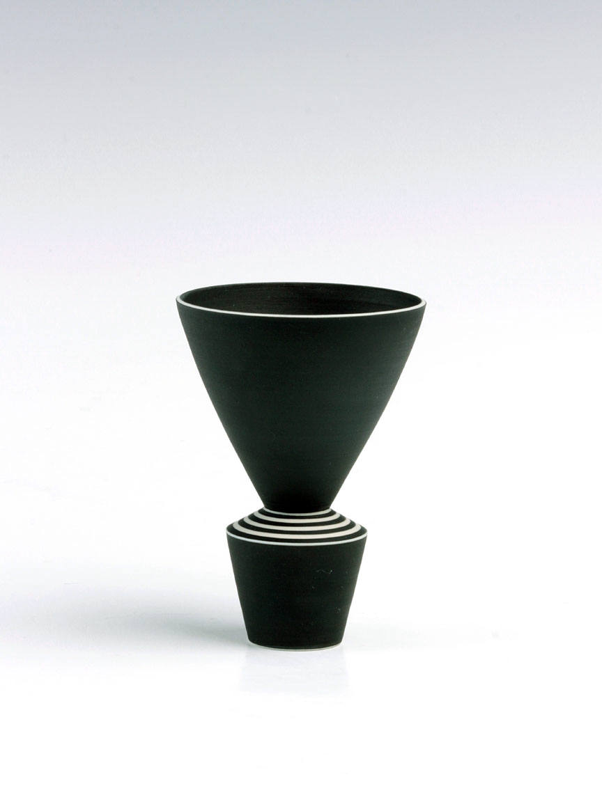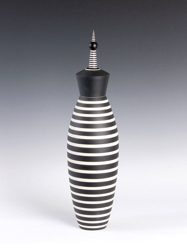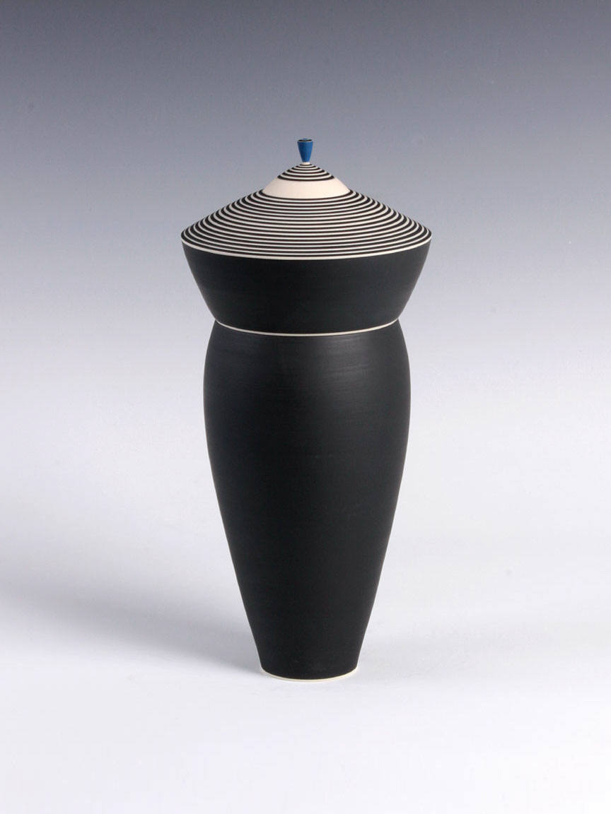 This exhibition will include a selection of work produced in the 1980s and 90s, illustrating the artist's move towards progressively larger forms. Although most of her early work was made in the demanding medium of fired porcelain, Delisle turned to an earthenware clay body to accommodate her desire to build larger-scale figurative pieces. Her largest works are composed of several pieces, which stack together seamlessly. The work was formed and decorated on the wheel, the fundamental basis of Delisle's practice. Horizontal striping in black, white, and blue both accentuates and disrupts the smooth proportions of her wheel-thrown forms. Referring to Delisle's work, McKenna also wrote that "As aesthetic forms, they're structured around a number of oppositions: profile versus surface; vertical thrust versus horizontal stripe; order versus whimsy; color versus form. Perhaps most important, what they do is take another opposition – art versus craft – and skewer it with wit and shocking grace."