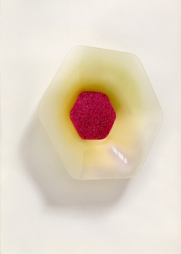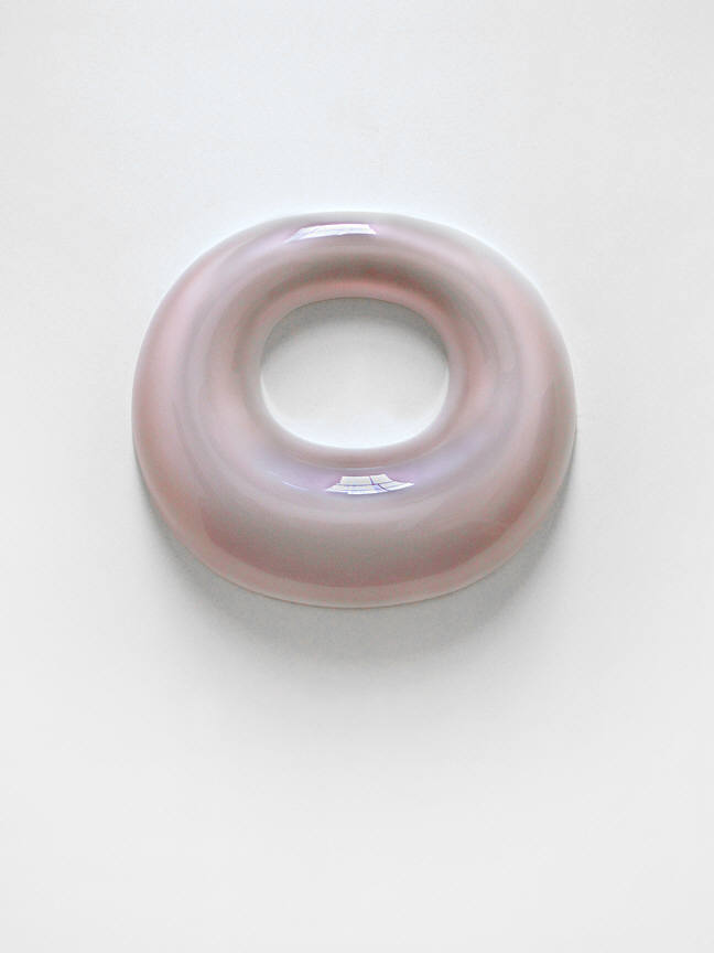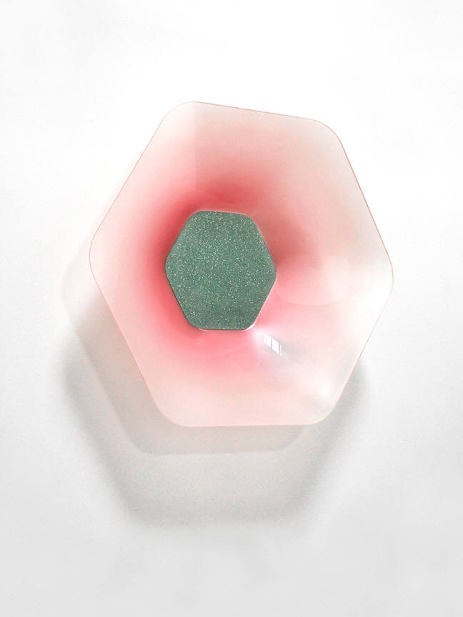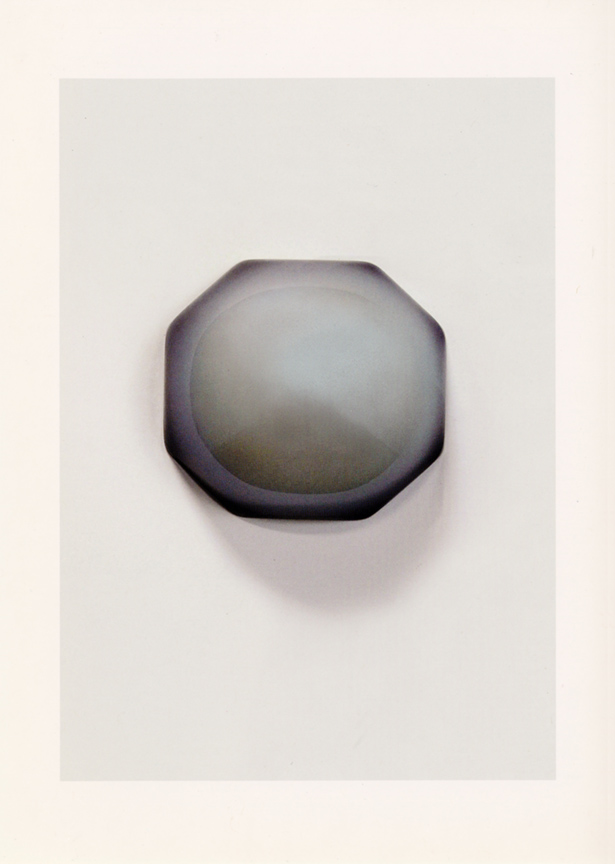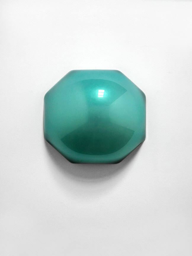 Kauffman himself took a firm position regarding his chosen materials, writing in his statement for A New Aesthetic, 1967 that: "I didn't start out with the idea of an industrial aesthetic. I believe the artist's strength lies not primarily in his intellect, but in his sensibility turned into intelligence. I began working in plastic with an idea of form it is true, but my principal impetus was a passion for a kind of color, a kind of light, a sensual response to material." This responsiveness to material and sensitivity to color relationships characterizes Kauffman's oeuvre. The late works on display achieve their lush presence through the artist's integration of spray-painted color and form.