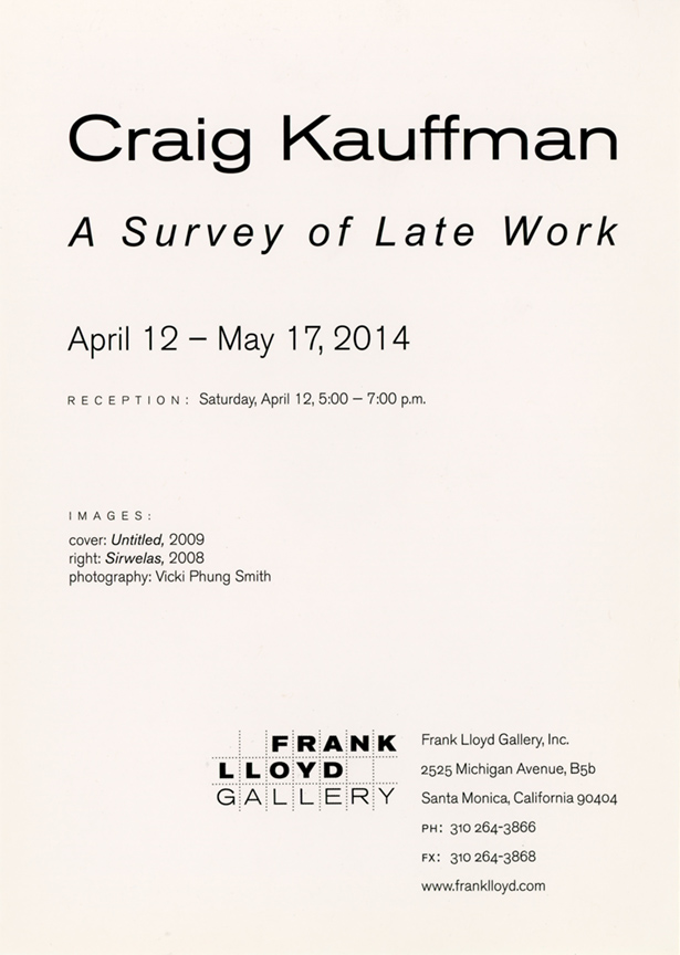 The Frank Lloyd Gallery is pleased to announce the opening of an exhibition of late works by Craig Kauffman. Produced between 2001 through 2009, these wall relief paintings represent the artist's lifelong investigation into translucent color and its perceptual effects. The works pulse with thinly applied layers of iridescent paint, achieving a glowing, atmospheric quality that illustrates Kauffman's enduring interest in light and perception.