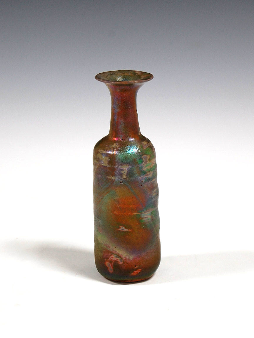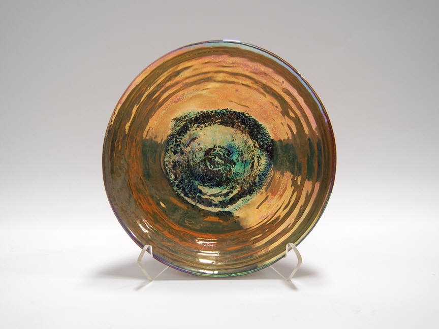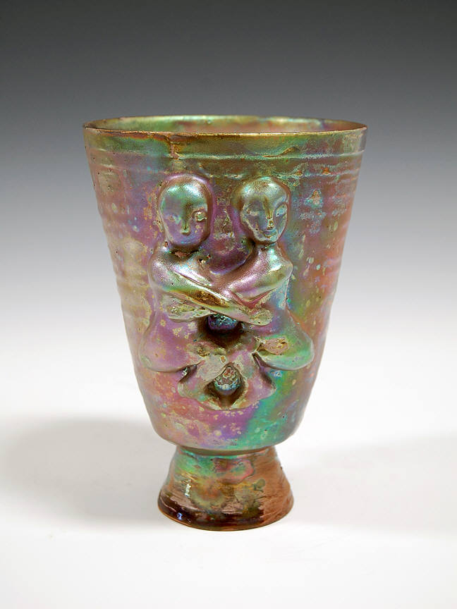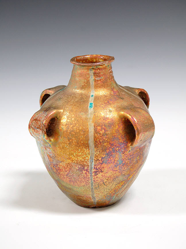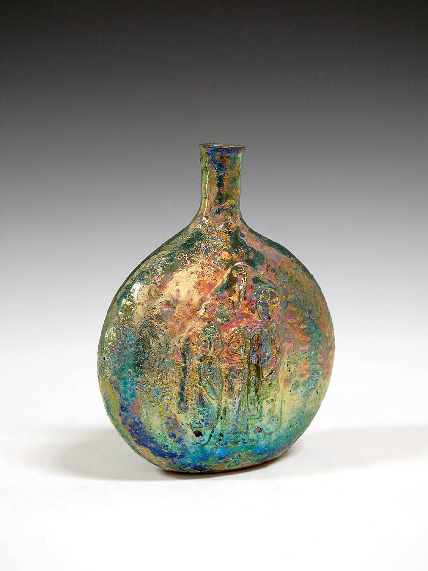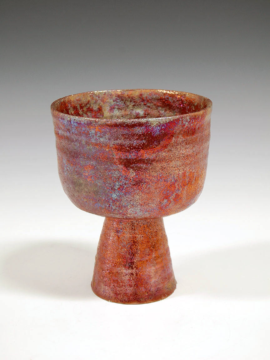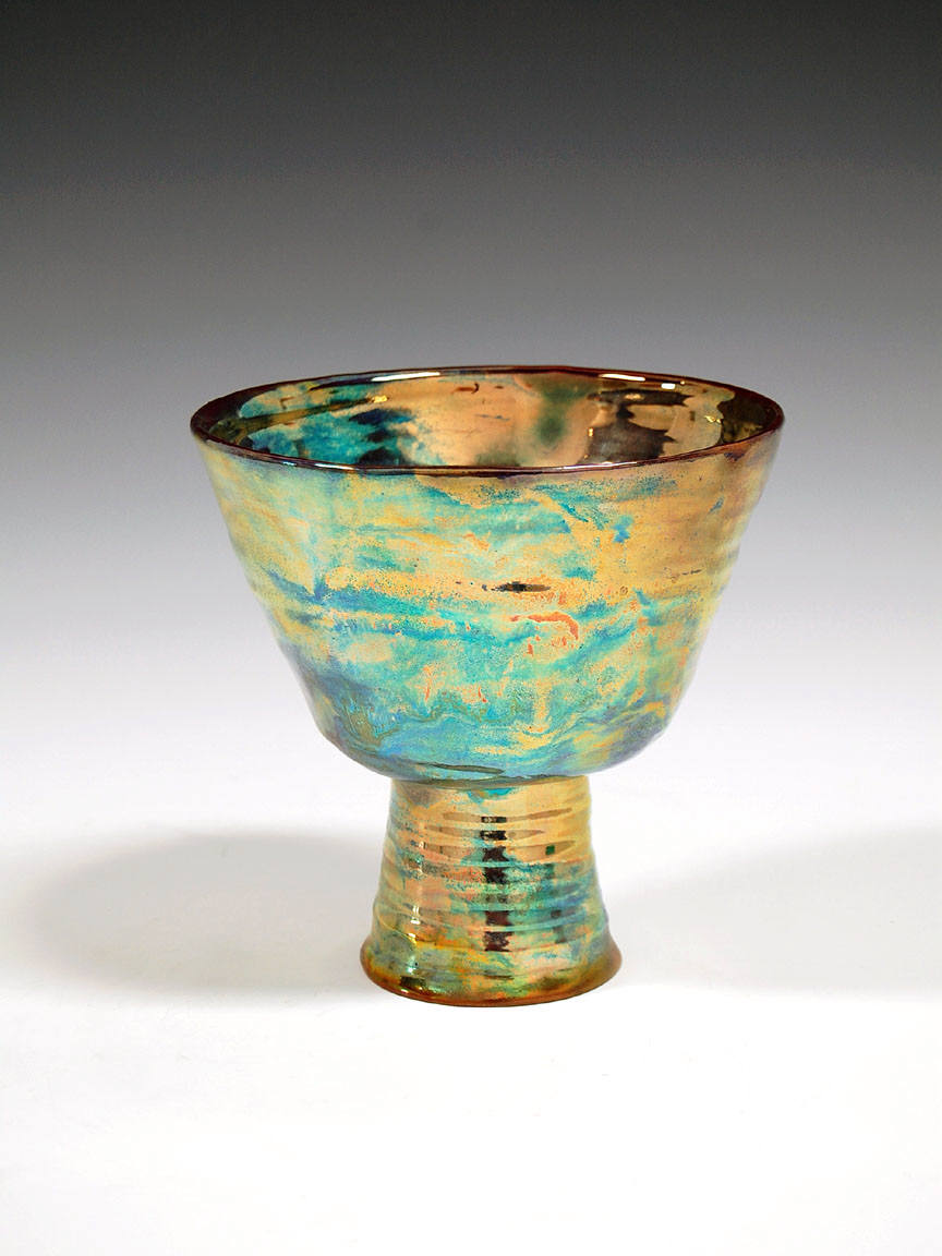 The gallery is also exhibiting a selection of works by renowned ceramist Beatrice Wood. These pieces are remarkable examples of Wood's signature luster glazing techniques, developed over the course of her long and extraordinary life. Her use of simple forms contrasts with the richly complex surfaces of her work. The works have the elegant presence of artifacts unearthed from an ancient civilization. Shimmering, gilded colors animate these pieces, catching the light and drawing the viewer in closer.