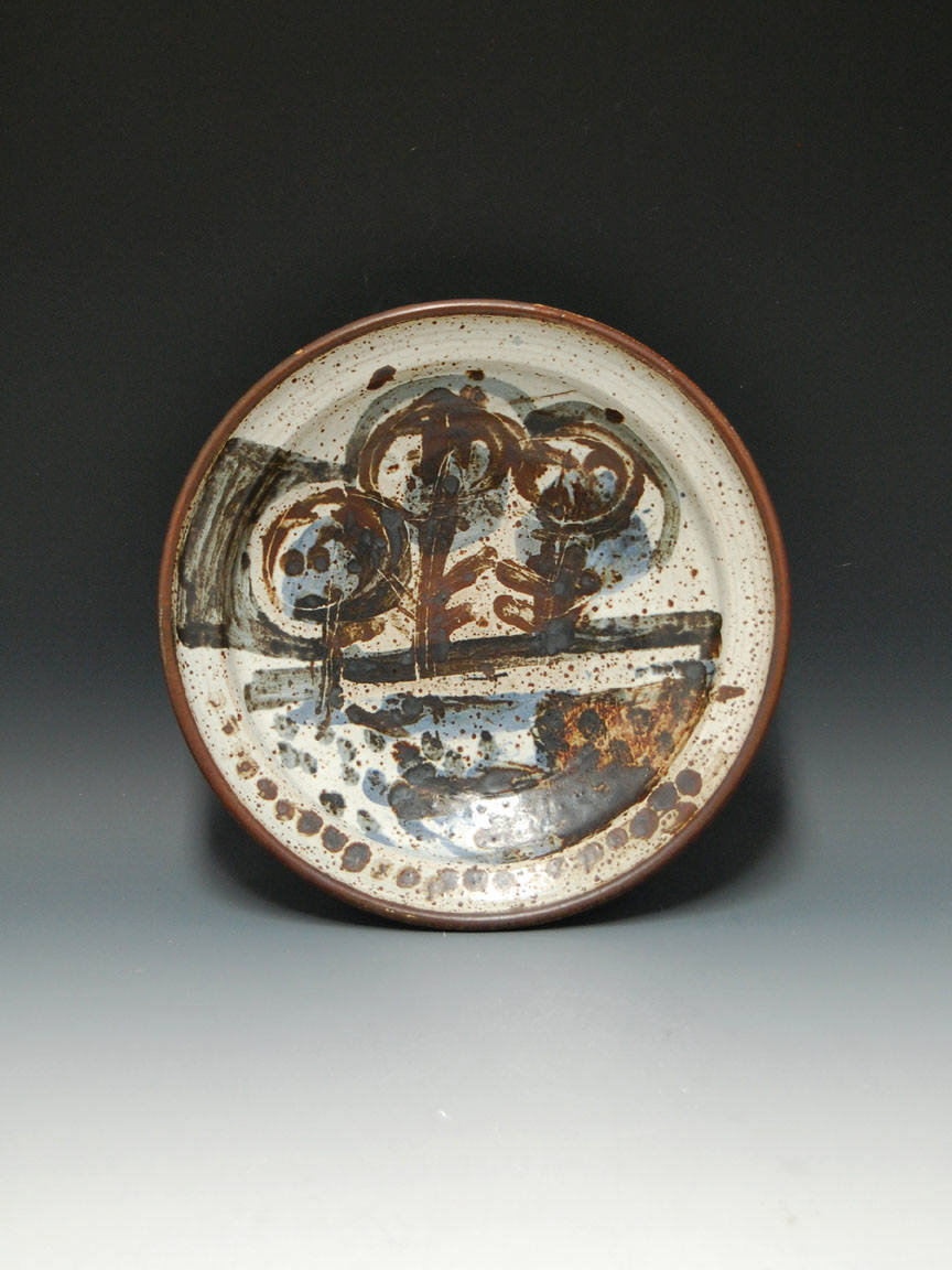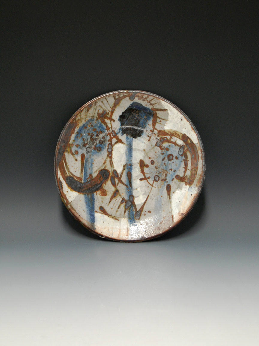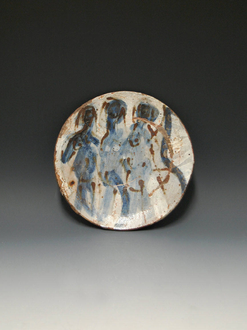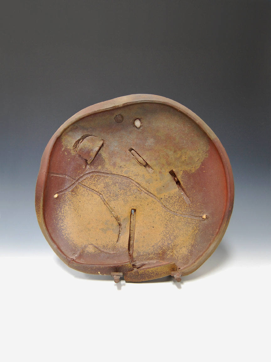 The Peter Voulkos works on view in this exhibition span the period of time from 1954 to 2000. Included are early examples of pottery, with pieces that are slashed and gouged, as well as forms that are often associated with the artist, such as the "plate" form. Aggressively manipulated and incised, the ceramic surfaces of his works serve as a "meeting ground for painting and sculpture," as noted in the New York Times. He dealt with the medium in a manner described by his colleague Ken Price as "direct frontal assault." The prints, on view alongside his ceramic artworks, demonstrate the same incised line, and powerful imagery.