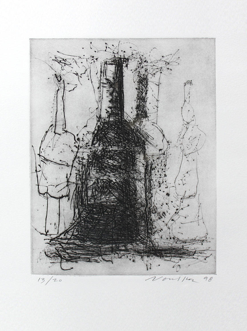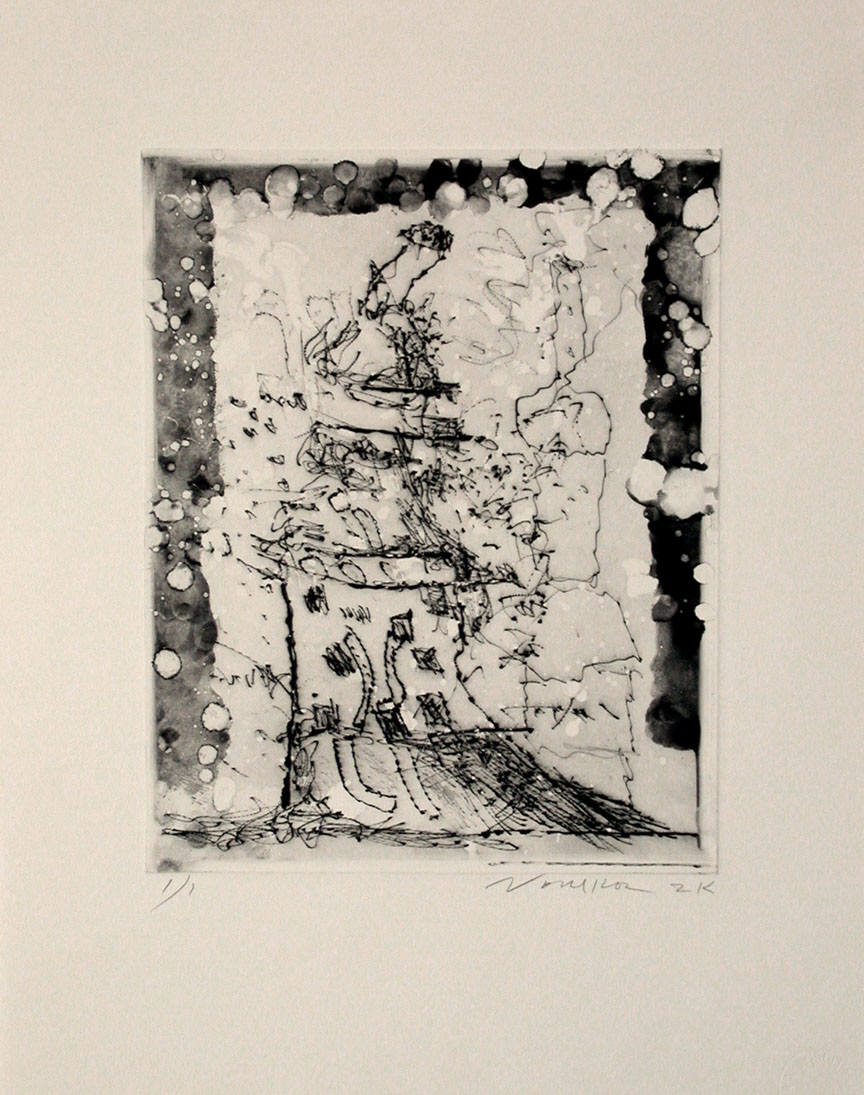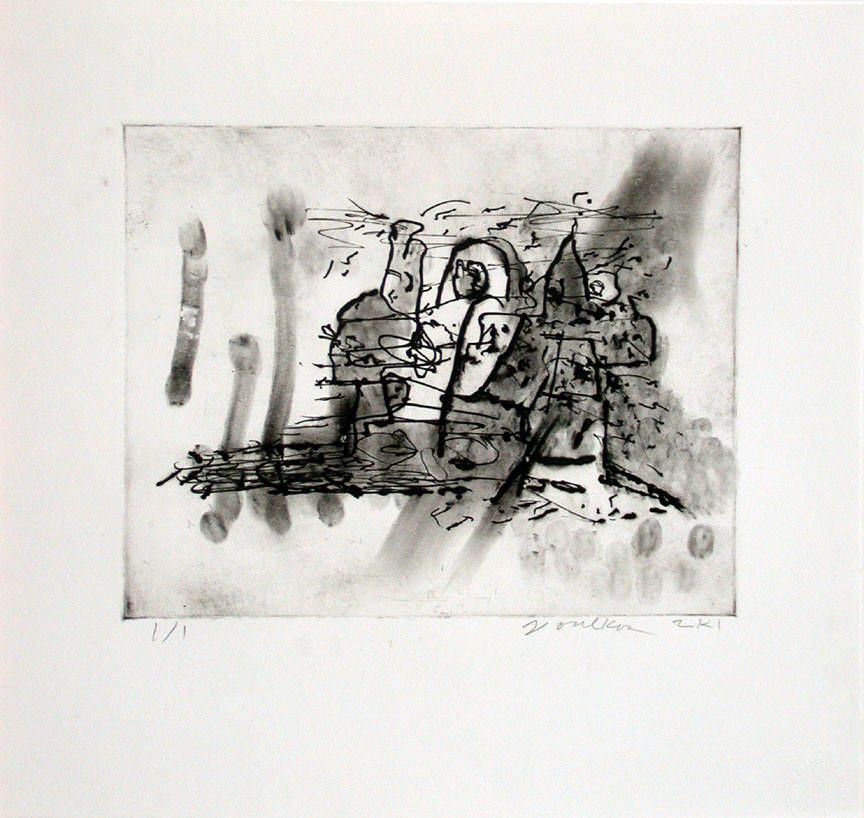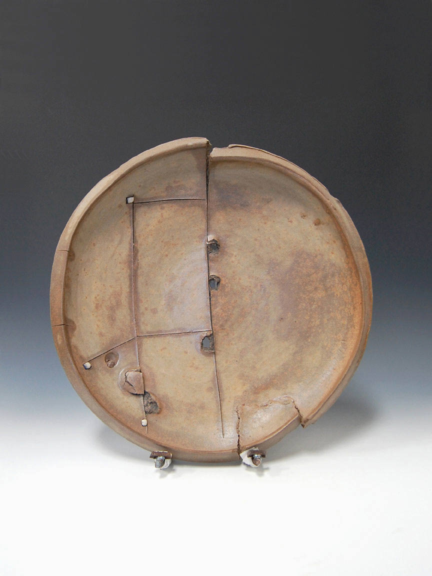 The Peter Voulkos works on view in this exhibition span the period of time from 1954 to 2000. Included are early examples of pottery, with pieces that are slashed and gouged, as well as forms that are often associated with the artist, such as the "plate" form. Aggressively manipulated and incised, the ceramic surfaces of his works serve as a "meeting ground for painting and sculpture," as noted in the New York Times. He dealt with the medium in a manner described by his colleague Ken Price as "direct frontal assault." The prints, on view alongside his ceramic artworks, demonstrate the same incised line, and powerful imagery.