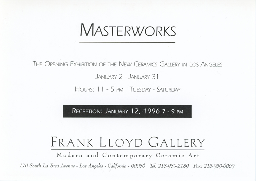 Ralph Bacerra, Philip Cornelius, Roseline Delisle, Richard DeVore, John Mason, Ron Nagle, Adrian Saxe, Peter Voulkos, Beatrice Wood, and Ken Price