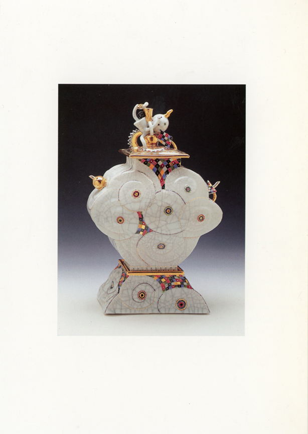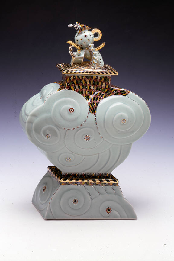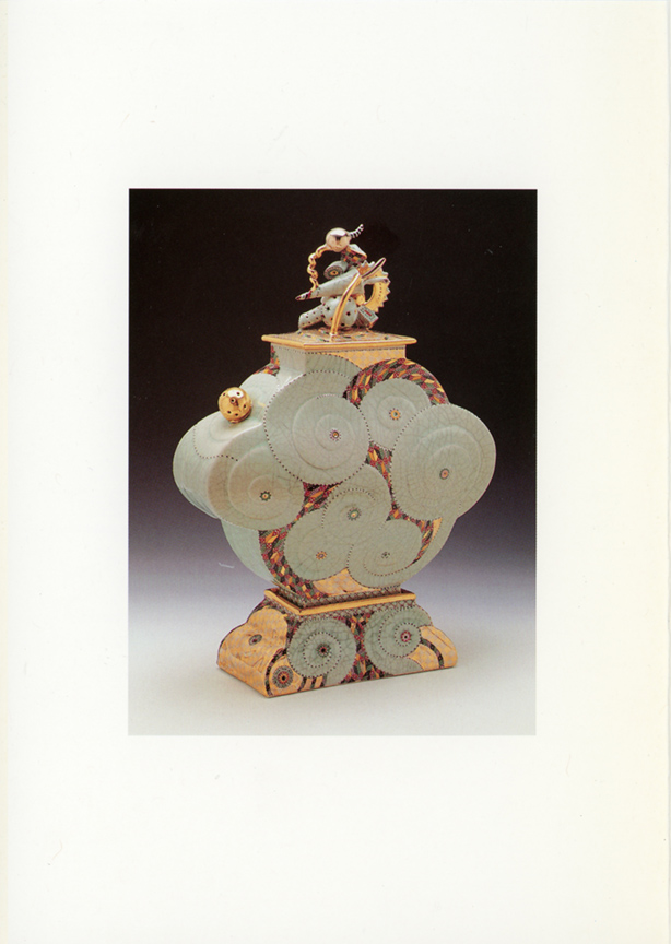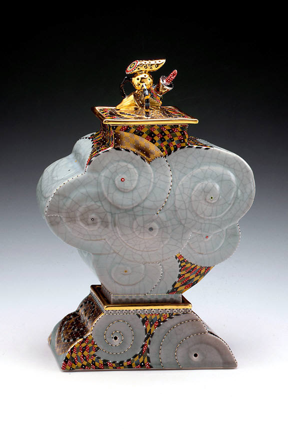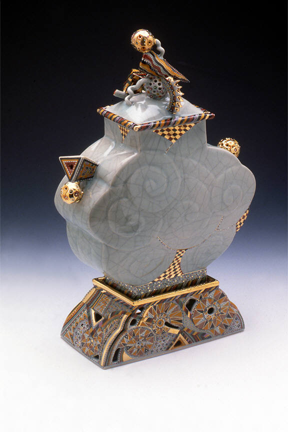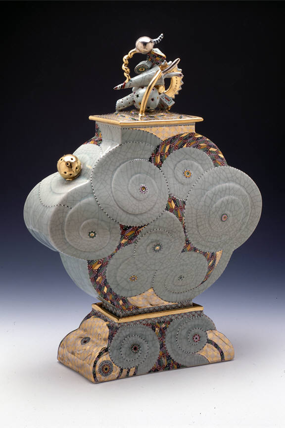 Today in the studio. however, it seems that the artist is reaching for a quieter, perhaps more classical posture: his recent porcelain cloud vessels derive from an invitation to create a ritual, nine-candled menorah for The Jewish Museum in San Francisco. Casting about for a suitable image to represent the spiritual dimension he needed, he settled on the spiral "horse's eye" pattern that he found in Asian pottery and scroll paintings as a stylized representation of clouds, and on the versatile celadon glaze to evoke a sense of classical serenity. Condensing all Bacerra's earlier geometric high jinx into a single, tightly-packed and whimsical miniature atop the vessel's lid and severely restricting the decorative area on the body and base, these works allow ample surface space for the eye that seeks rest between the passages of activity. The celadon glazes, ranging from delicately crackled white to deep, seemingly transparent hues with hints of green, or blue or brown, suggest a new sense of authority in the artist's touch, and a new trust that silence, too, is eloquent.
