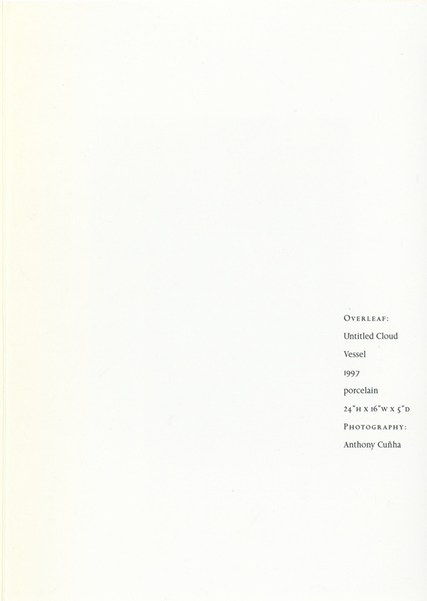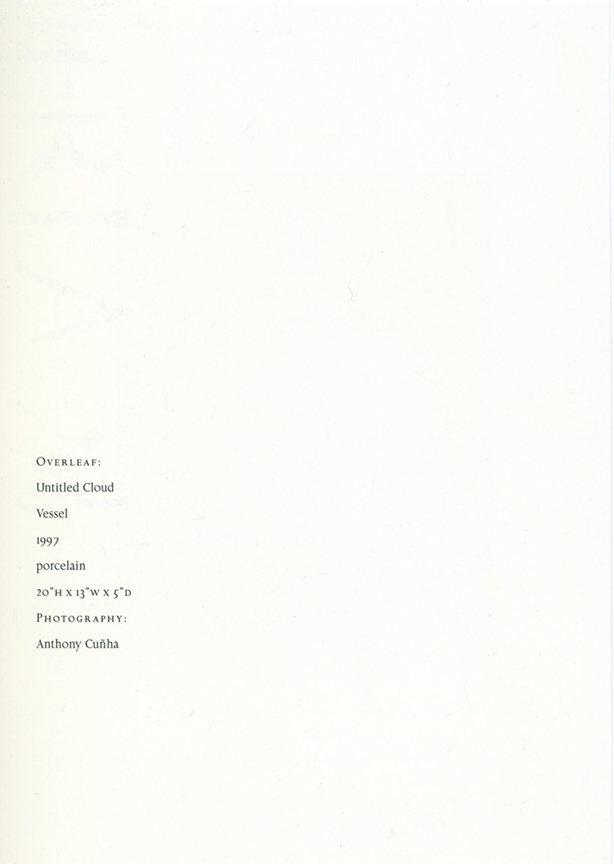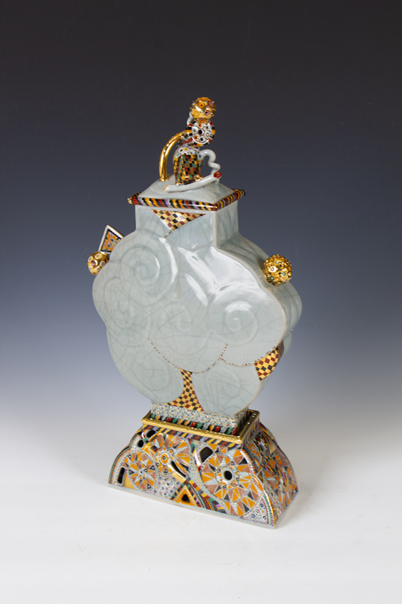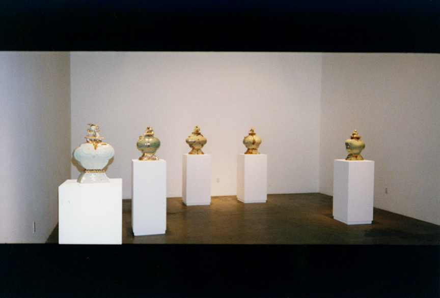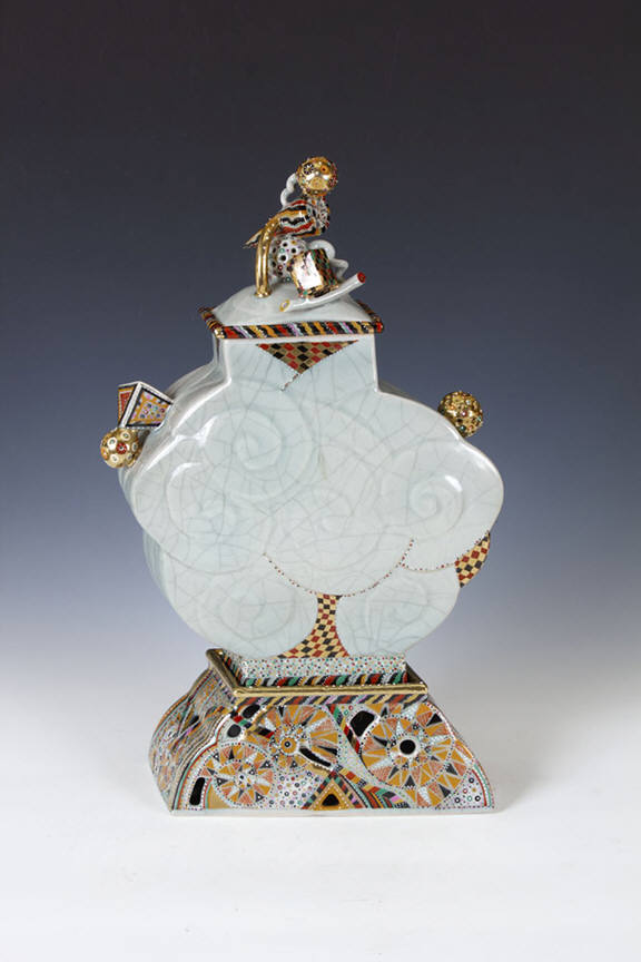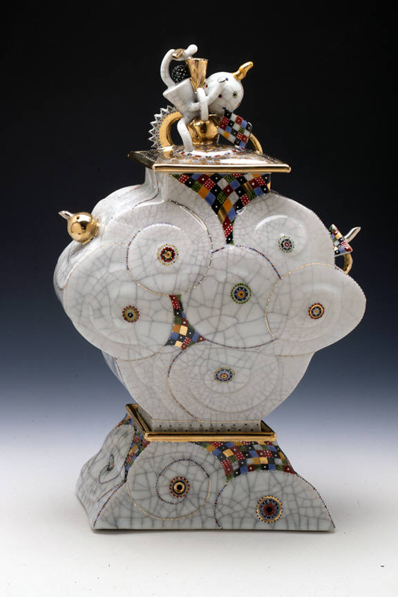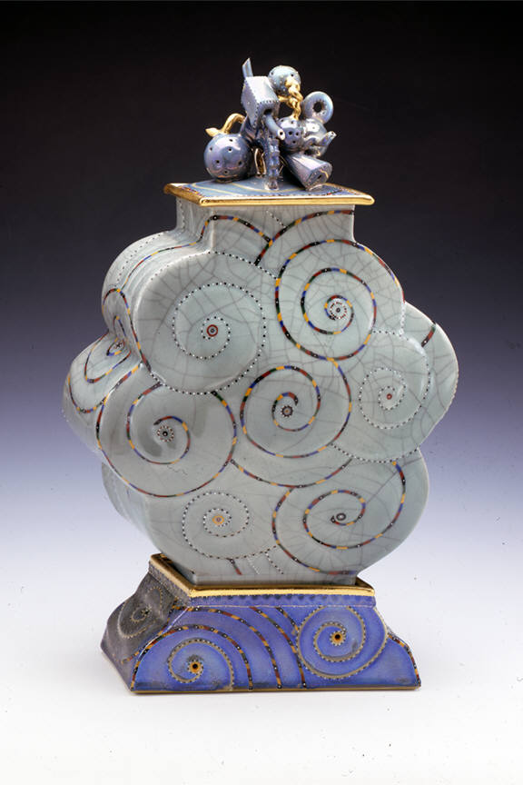 Today in the studio. however, it seems that the artist is reaching for a quieter, perhaps more classical posture: his recent porcelain cloud vessels derive from an invitation to create a ritual, nine-candled menorah for The Jewish Museum in San Francisco. Casting about for a suitable image to represent the spiritual dimension he needed, he settled on the spiral "horse's eye" pattern that he found in Asian pottery and scroll paintings as a stylized representation of clouds, and on the versatile celadon glaze to evoke a sense of classical serenity. Condensing all Bacerra's earlier geometric high jinx into a single, tightly-packed and whimsical miniature atop the vessel's lid and severely restricting the decorative area on the body and base, these works allow ample surface space for the eye that seeks rest between the passages of activity. The celadon glazes, ranging from delicately crackled white to deep, seemingly transparent hues with hints of green, or blue or brown, suggest a new sense of authority in the artist's touch, and a new trust that silence, too, is eloquent.