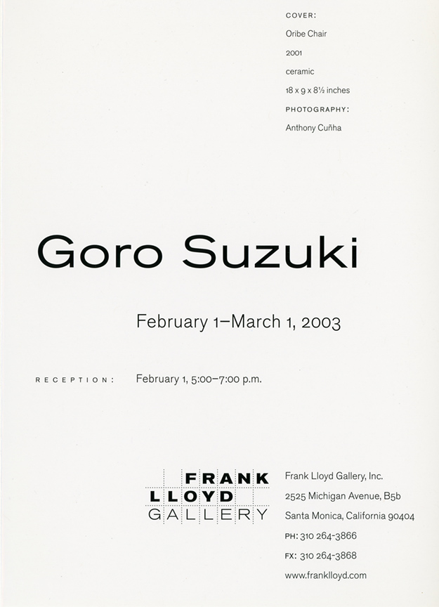 Goro Suzuki's work has been exhibited extensively in Japan, and is included in museum collections in that country as well as the United States. His work is represented in the Japanese Pavilion of the Los Angeles County Museum of Art, the Hetsens Museum in Dusseldorf, Germany, and the Marer Collection at Scripps College in Claremont, California.