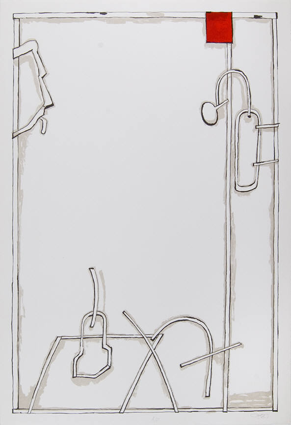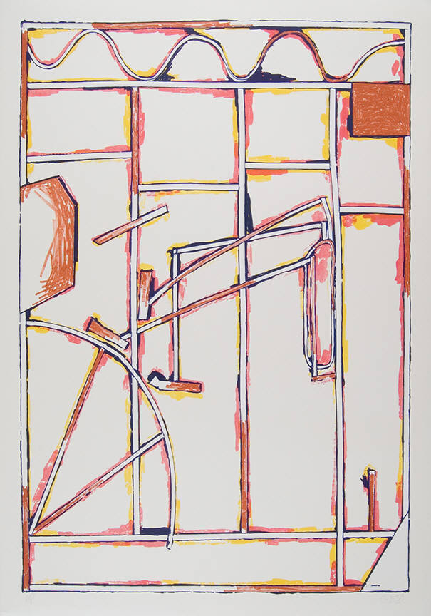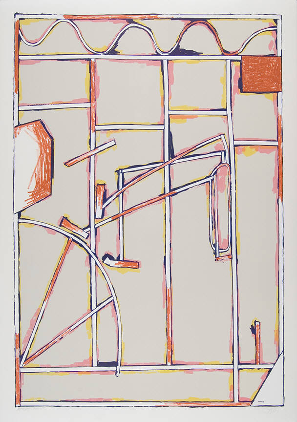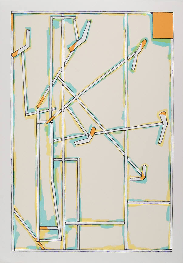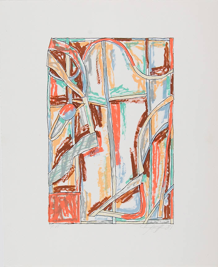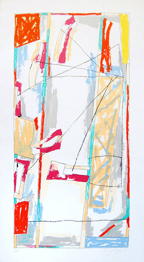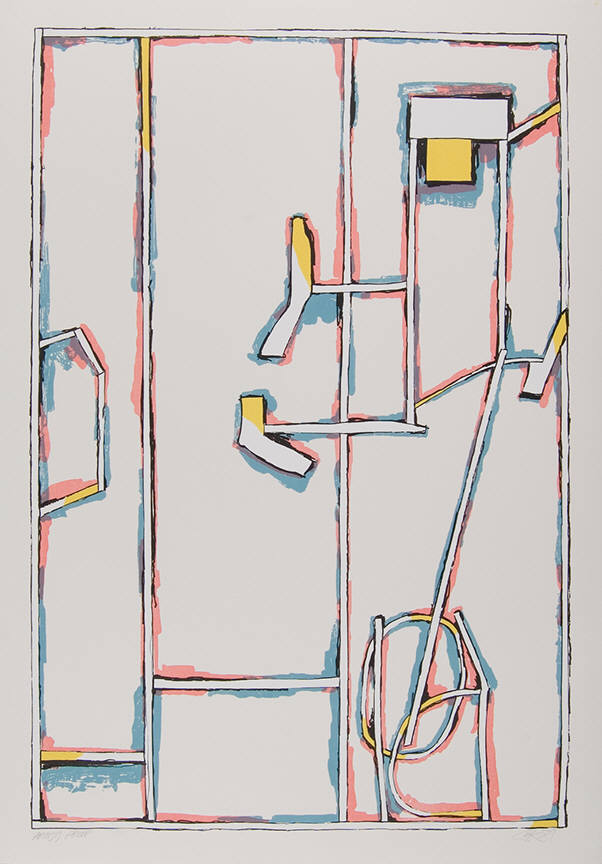 In 1980, Kauffman transferred his excitement over his collaged silk paintings to prints. For the paintings, he drew a black ink line around each white paper strip that he cut out and glued to the silk surface. But to emulate the effect in lithography was far more complicated. Milant recalled, "He had to draw that line onto the aluminum plates and make it look like a simulated cut line to make it look like it was pasted on and had the illusion of depth." The rest of the print was created using a brush and washes of color. These prints are close approximations of the paintings made around the same time — the interior of a room with a vase of flowers, or a pear on a table, or two faces in profile looking at one another. They are highly abstract, however, and the images are not easily deciphered. Seven vertical format lithographs, editions of 25, were printed in two sizes. The larger size, with a profile on the left, was 42 1/4 by 29 7/8 inches and printed in three states from color to black and white. The smaller size, 33 1/4 by 23 1/2 inches, were printed in two states, both in color.