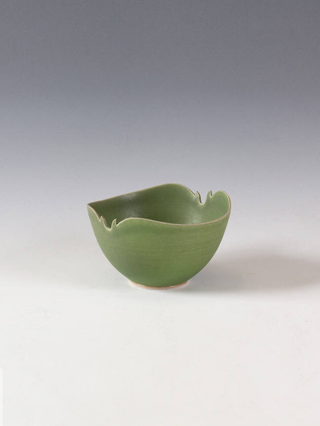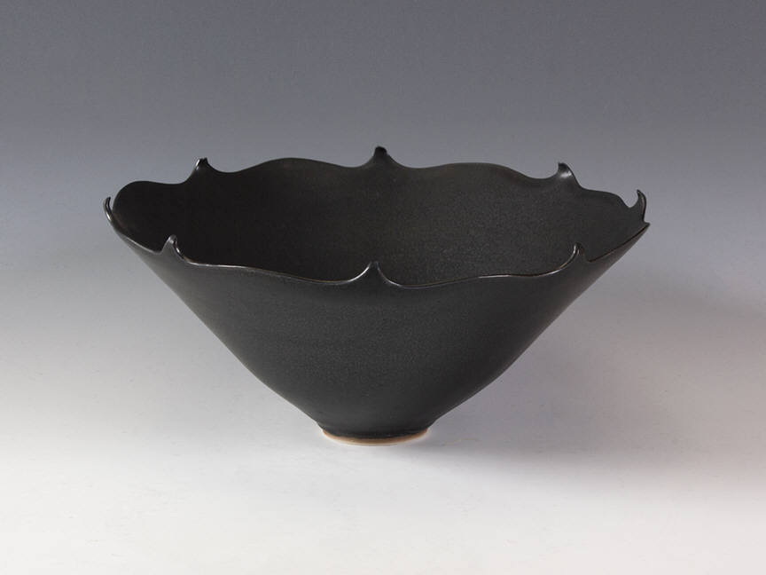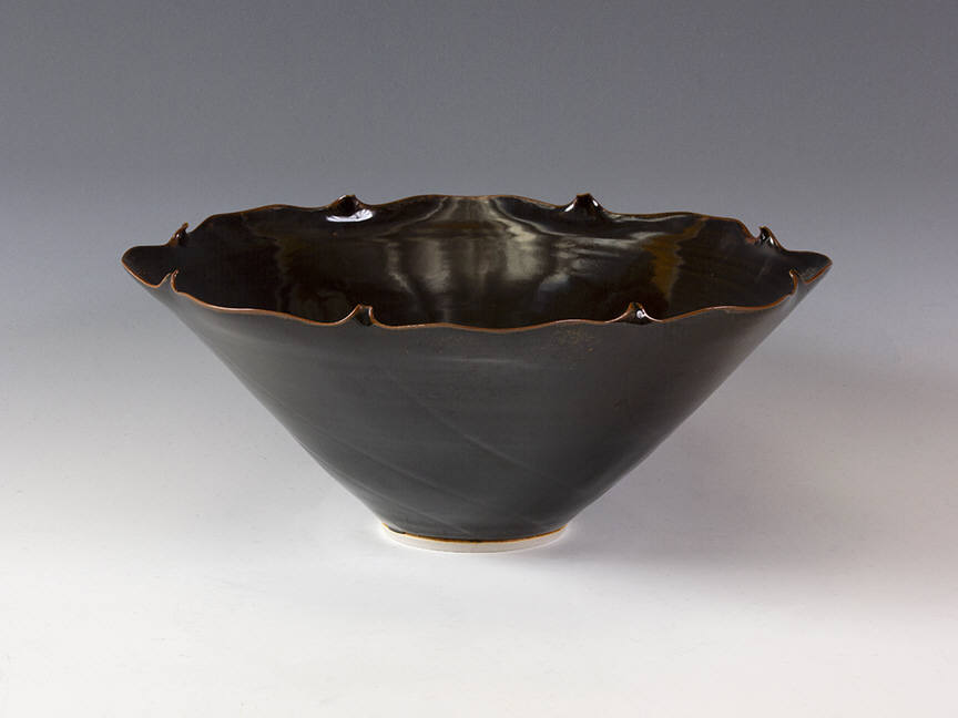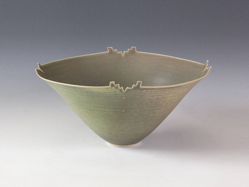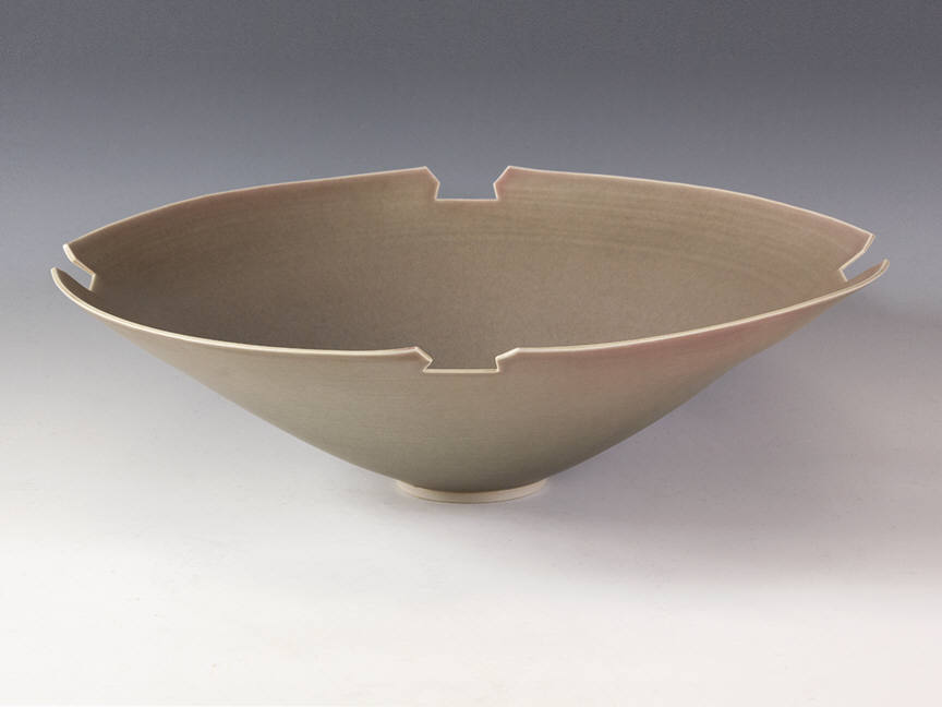The current exhibit focuses on vases and bowls inspired by porcelain forms of the Song Dynasty of Chinese art history. These works are thin, curving and delicate, and often have small notches on the rims of the vessel. The notches would become more pronounced as time went on. In the early 1970s, the cuts in the rim were small, but by 1978, Rady had become interested in other influences, even the swirls and spins of the process of forming, or the progressions on Art Deco buildings. The works in our current exhibit range in date from 1970 to 1980, and encompass this transition.
