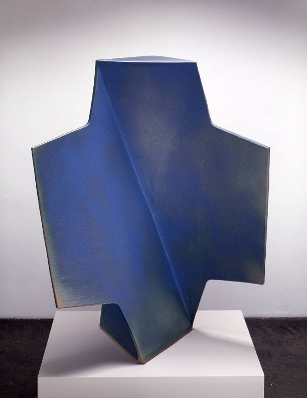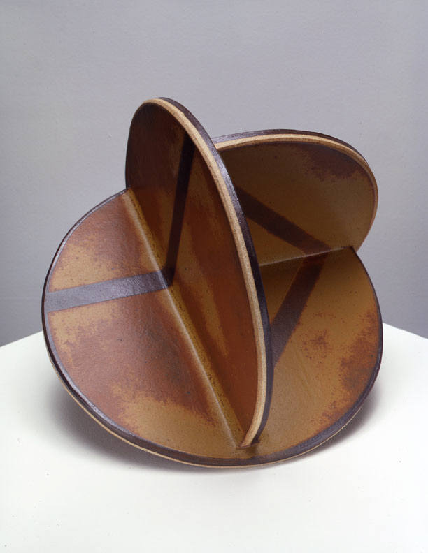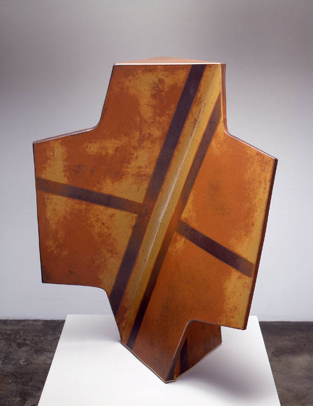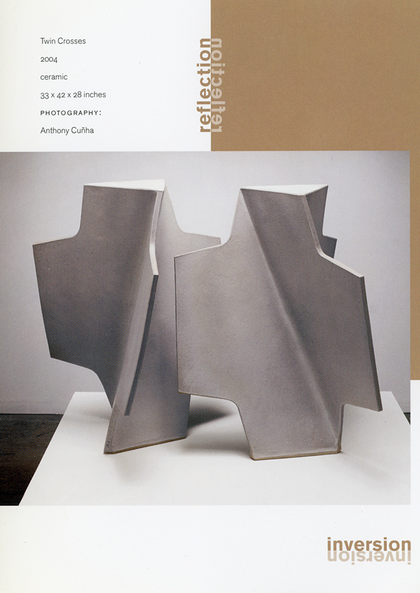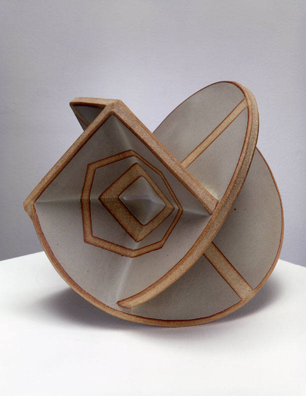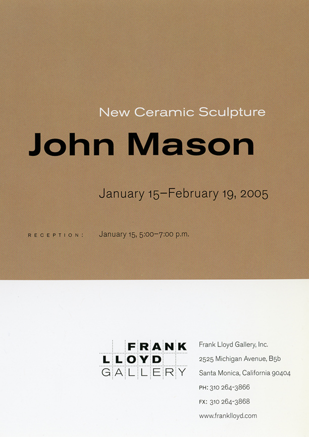 In a one person show at the Frank Lloyd Gallery from January 15 – February 19, 2005, John Mason will present new ceramic sculpture. The exhibition will include an extension of Mason's Orbits series, as well as an installation of his Crosses. The Orbits, elegant geometric sculptures, are made of rounded planes that extend from a central axis. Simple, linear designs trace their surfaces. The larger, more angular Crosses bend and fold in complex patterns. Powerful but refined, the Crosses are constructed of slabs of clay and fired as one massive, monochromatic form.