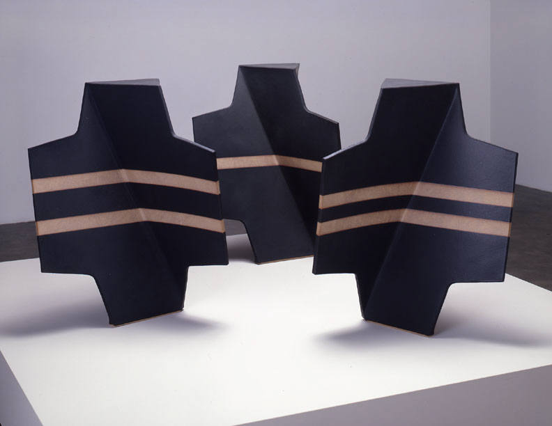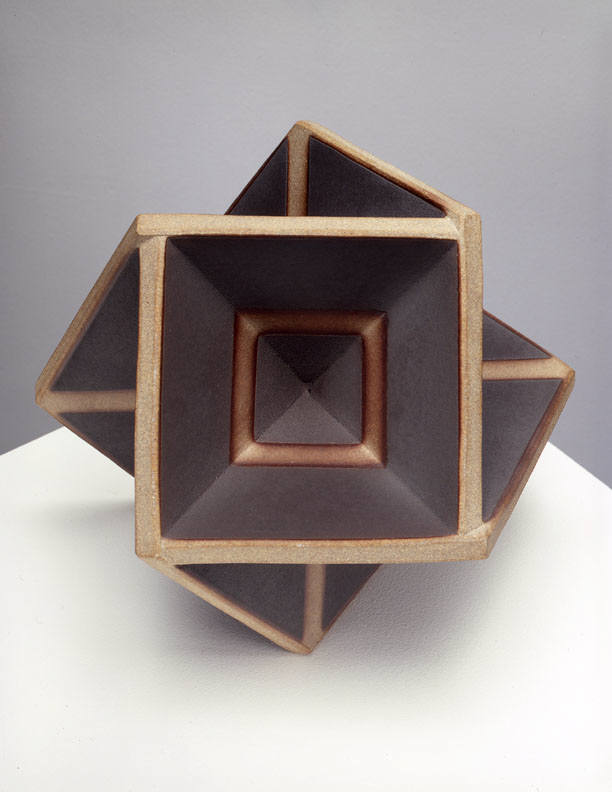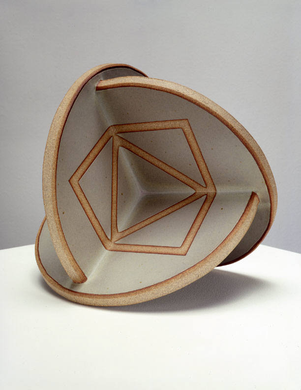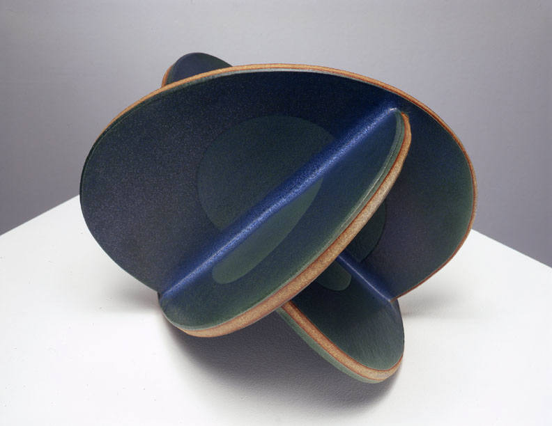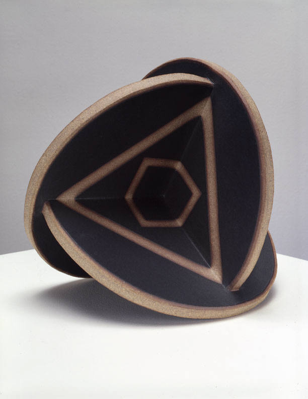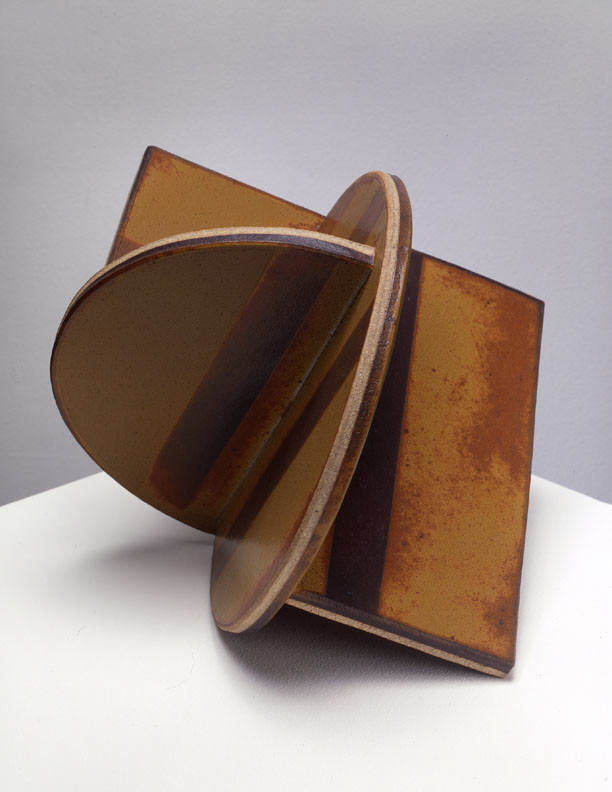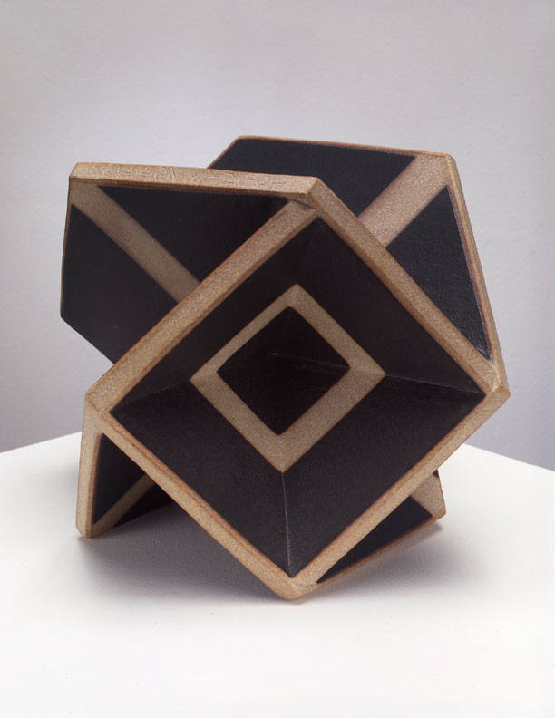 In a one person show at the Frank Lloyd Gallery from January 15 – February 19, 2005, John Mason will present new ceramic sculpture. The exhibition will include an extension of Mason's Orbits series, as well as an installation of his Crosses. The Orbits, elegant geometric sculptures, are made of rounded planes that extend from a central axis. Simple, linear designs trace their surfaces. The larger, more angular Crosses bend and fold in complex patterns. Powerful but refined, the Crosses are constructed of slabs of clay and fired as one massive, monochromatic form.