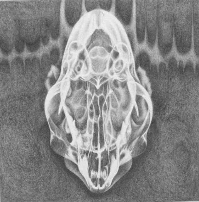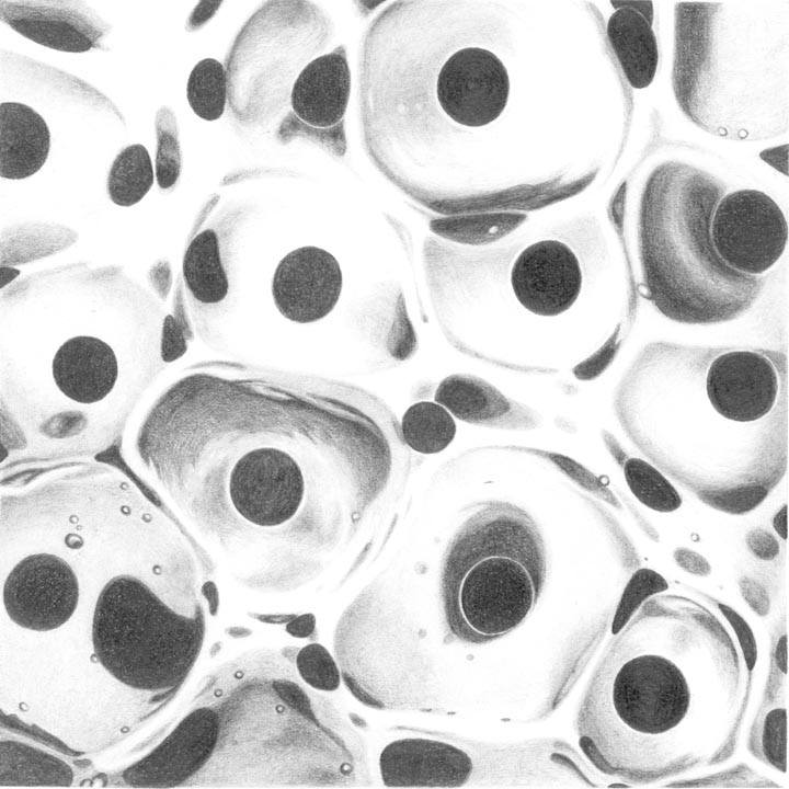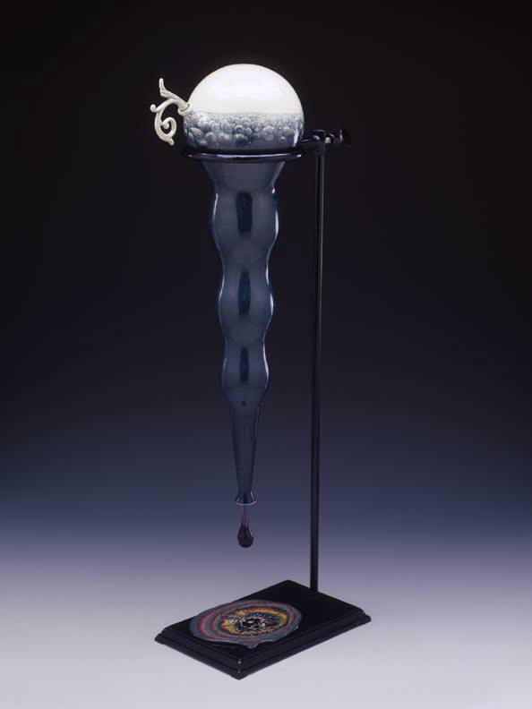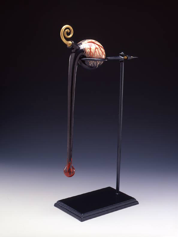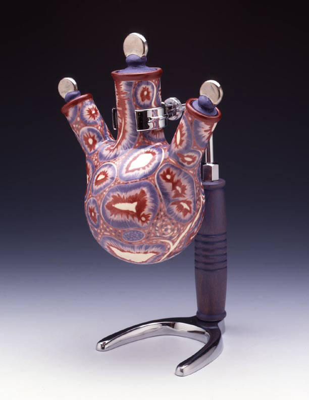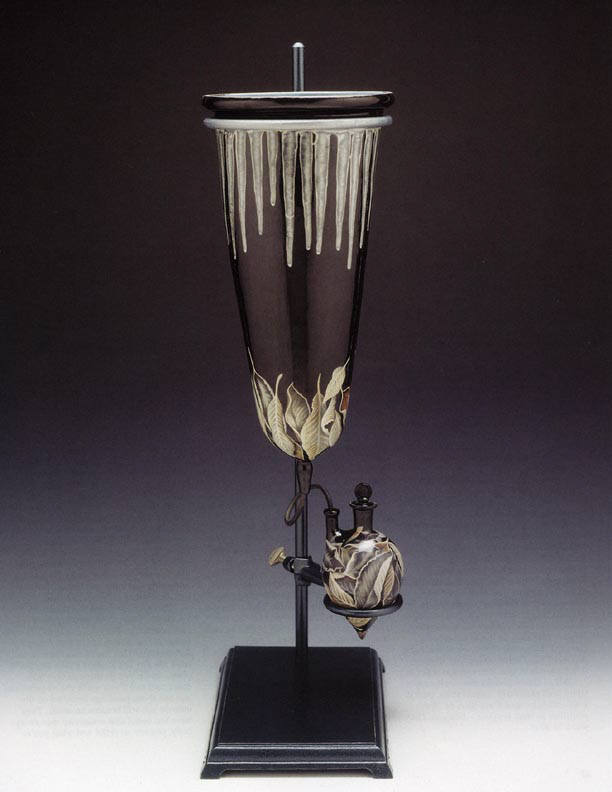 Tweaking form and abstracting familiar imagery, Kolodziejski creates a haunting new body of work. Cosmic Drip, a refined conical vessel suspended by an iron-black beaker stand, displays a delicate web of rosy cells that is both alluring and unsettling. At the vessel's tip hangs a small droplet of pinkish fluid, poised to fall. These combinations of the surreally beautiful with the vaguely creepy abound in Kolodziejski's work. As Peter Frank noted in a 2002 L.A. Weekly review,